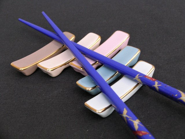 Zestaw pięciu porcelanowych podstawek pod pałeczki lub sztućce w wyjątkowo eleganckim doborze kolorystycznym. Na błyszcząco szkliwione, ze złoceniami na rantach. Jakość wykonania i przyjemna dźwięczność porcelany :) 6,5 x 1,5 x 1,2 cm. Stan zachowania bardzo dobry.