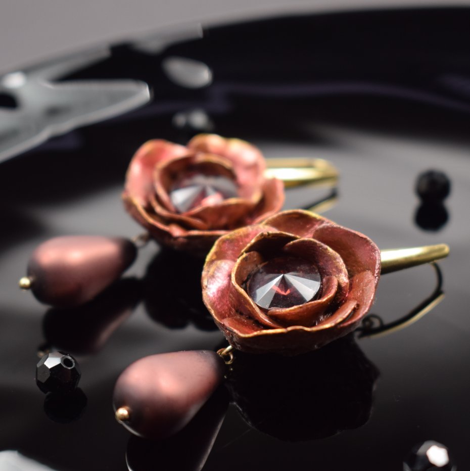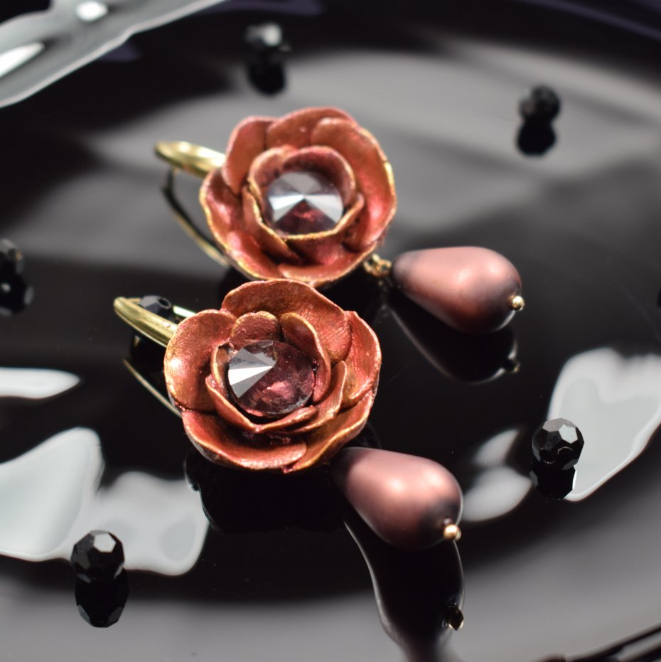 Eleganckie i wyjątkowe kolczyki kwiaty w odcieniu brązu delikatnie wpadającego w bordo, ręcznie wykonane z najwyższej jakości glinki polimerowej.