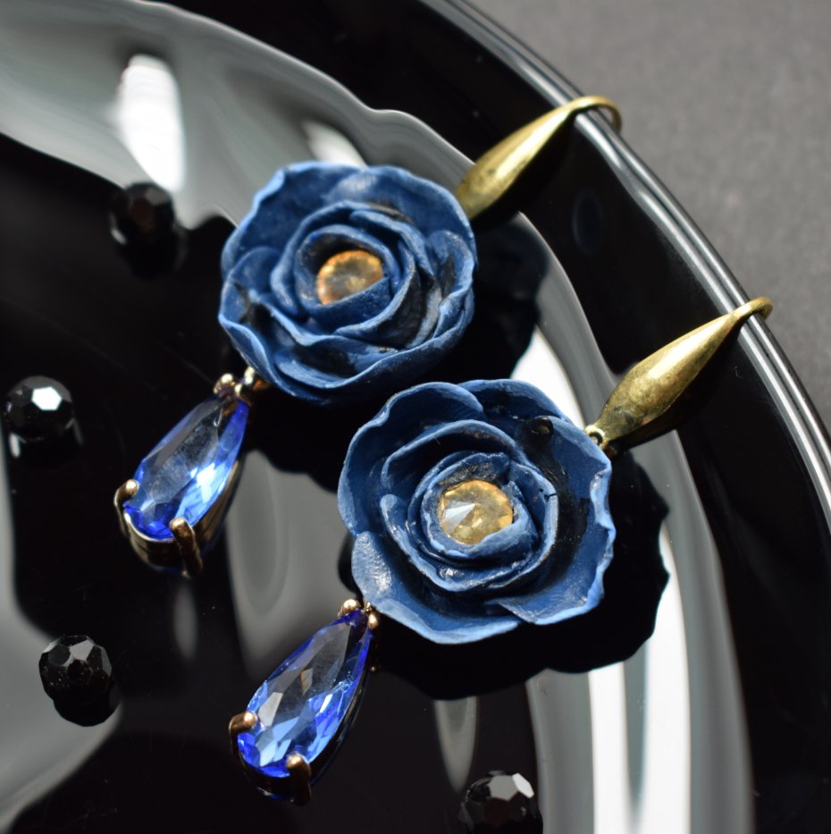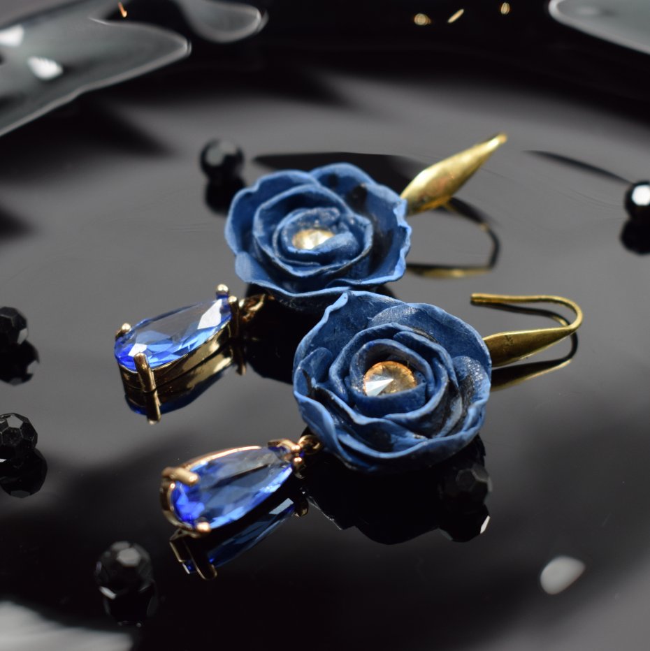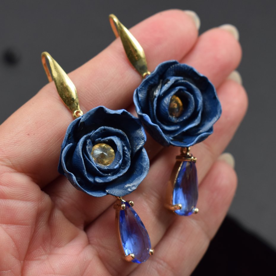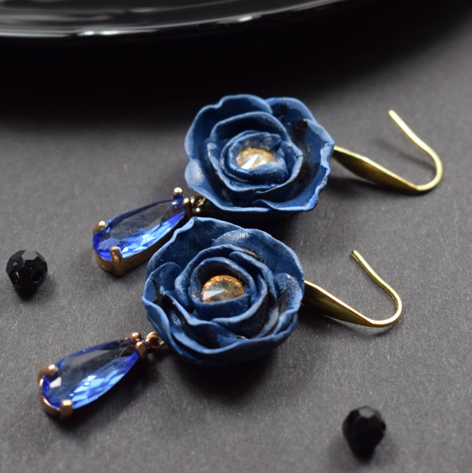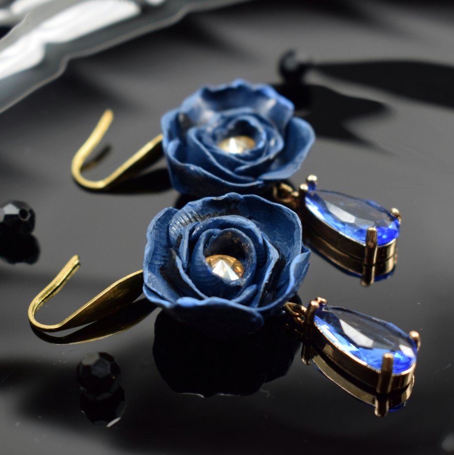 Eleganckie, ręcznie robione kolczyki, które zachwycają subtelną formą i wyjątkowym wykończeniem. Kwiaty zostały uformowane z wysokiej jakości glinki polimerowej w odcieniach niebieskiego - od głębokiego granatu po delikatny błękit. Ich serce zdobi błyszczący kryształ w złotym odcieniu, który pięknie współgra z kolorystyką kwiatów.