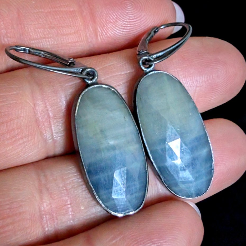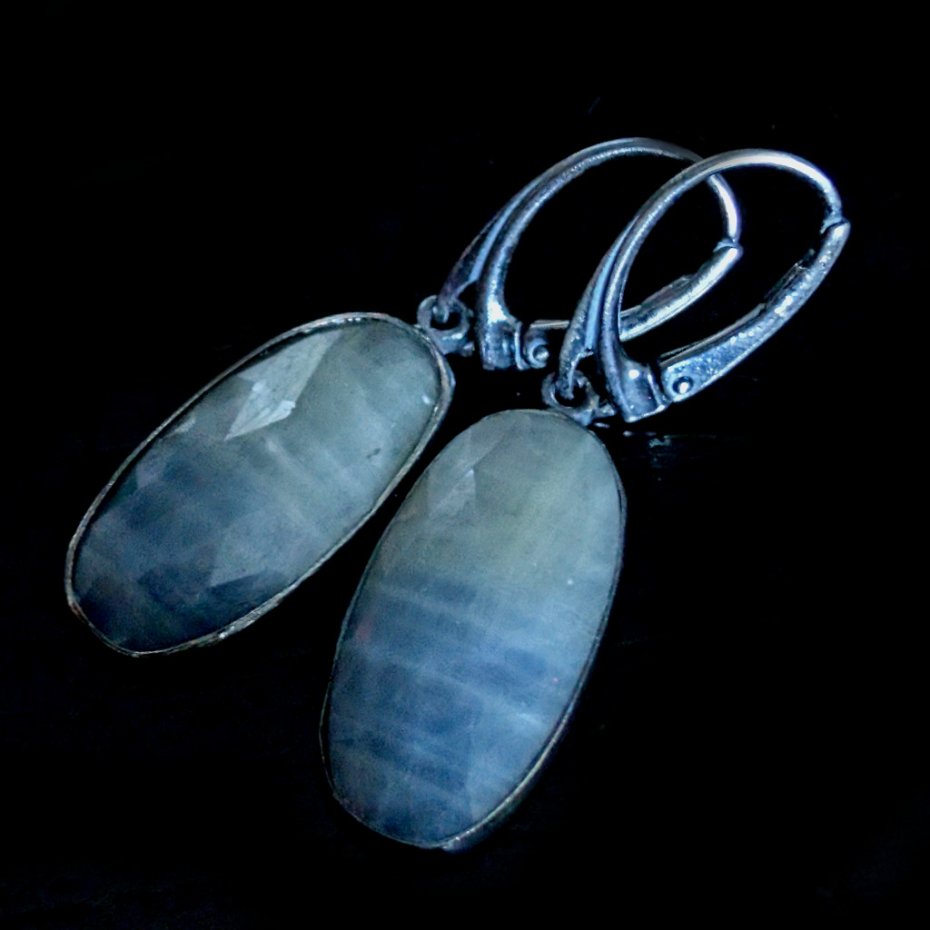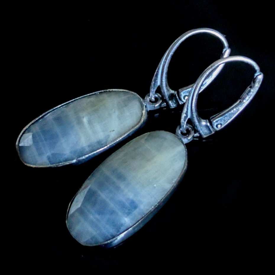 Piękne, tajemnicze szafiry o fasetowanej tafli w oprawie oksydowanego srebra próby 925. Wymiary oprawy kamieni 23 x 13 mm, długość z biglami 42 mm. Waga jednego kolczyka 4,6 g. Kolczyki zostaną zapakowane w ozdobne pudełeczko.