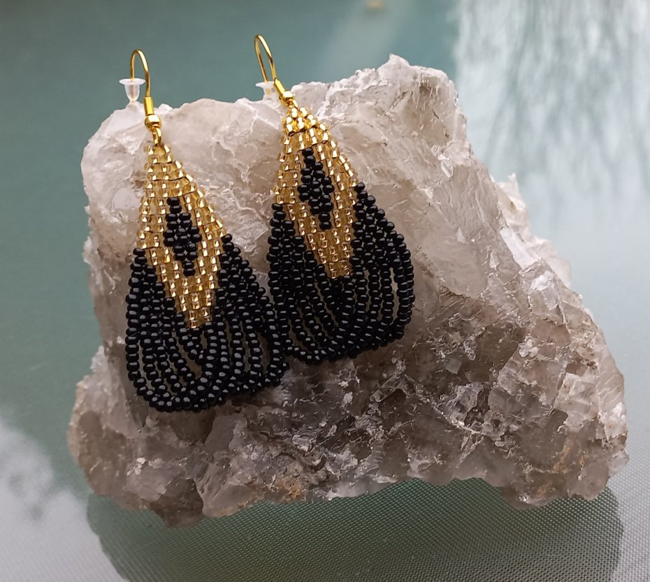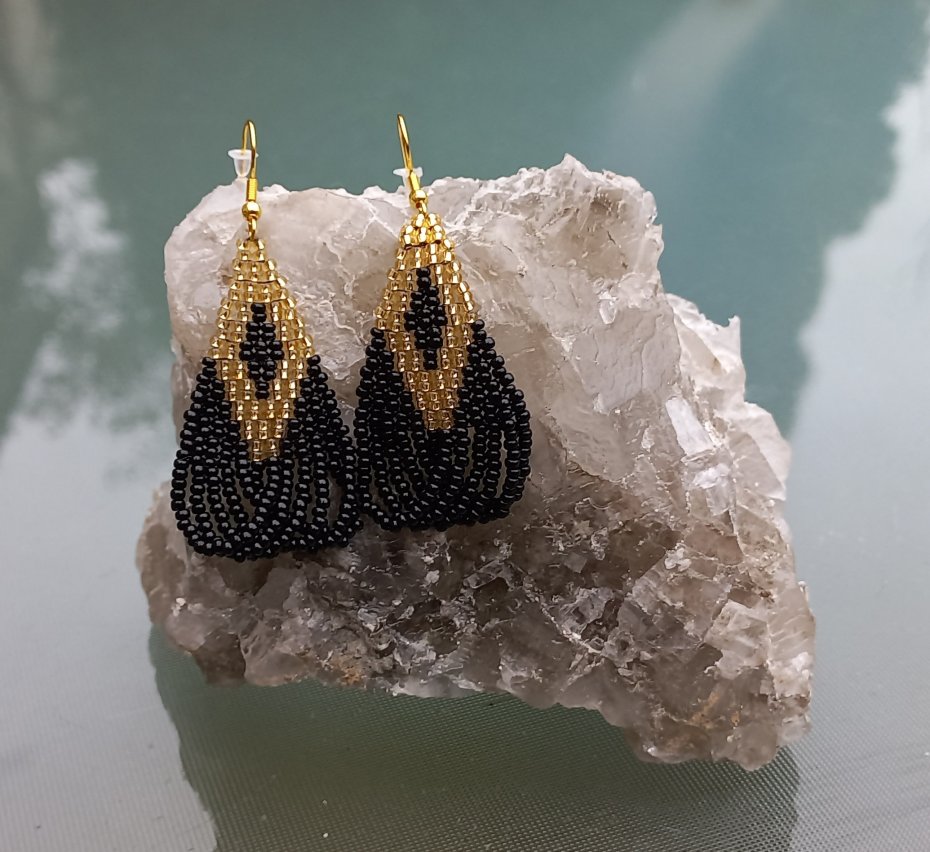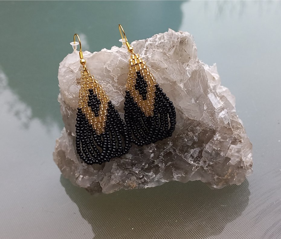 Odkryj idealny balans między klasyką a nowoczesnym designem. Te wiszące kolczyki to połączenie głębokiej, błyszczącej czerni z luksusowym złotem czeskich koralików. Wyjątkowy kształt rombu przyciąga spojrzenia i nadaje całości nowoczesnego, biżuteryjnego sznytu. Ich optymalna długość sprawia, że są zauważalne, a jednocześnie na tyle subtelne, by towarzyszyć Ci zarówno podczas biznesowego spotkania, jak i wieczornego wyjścia.