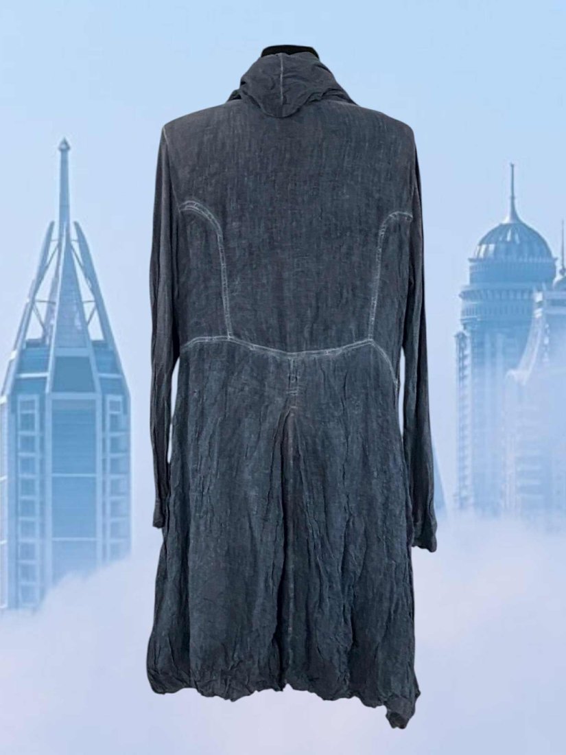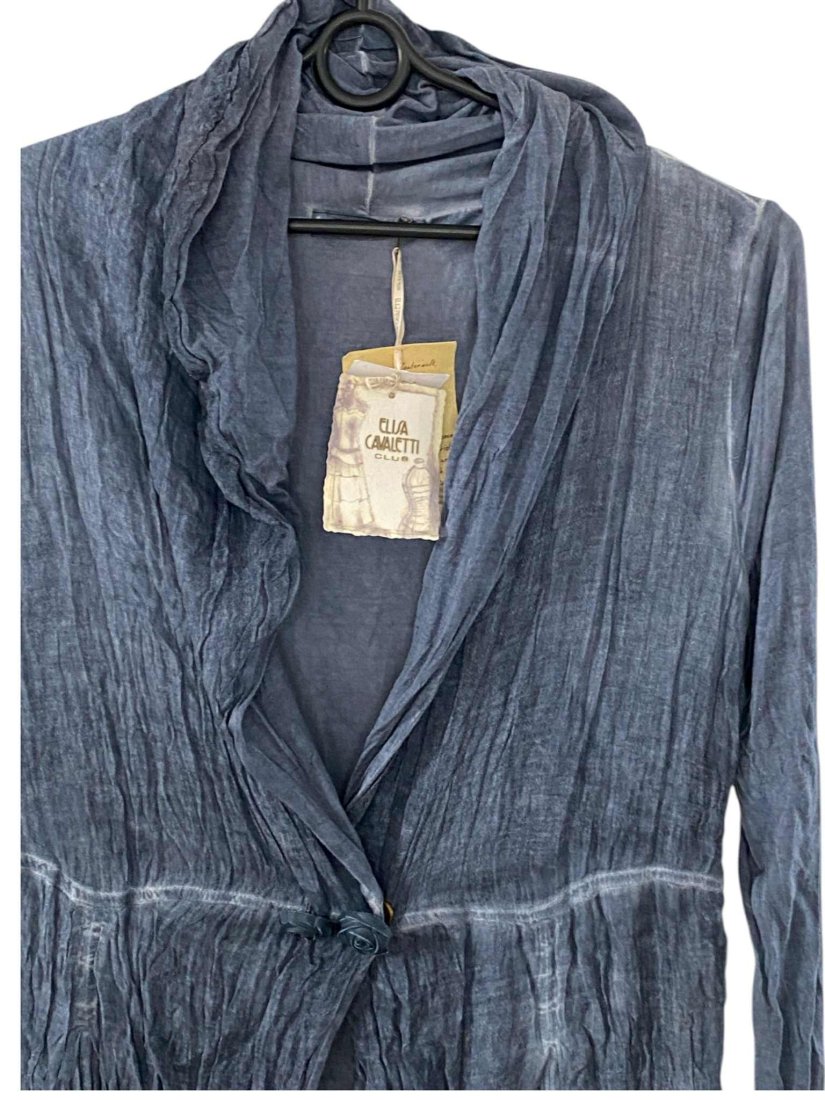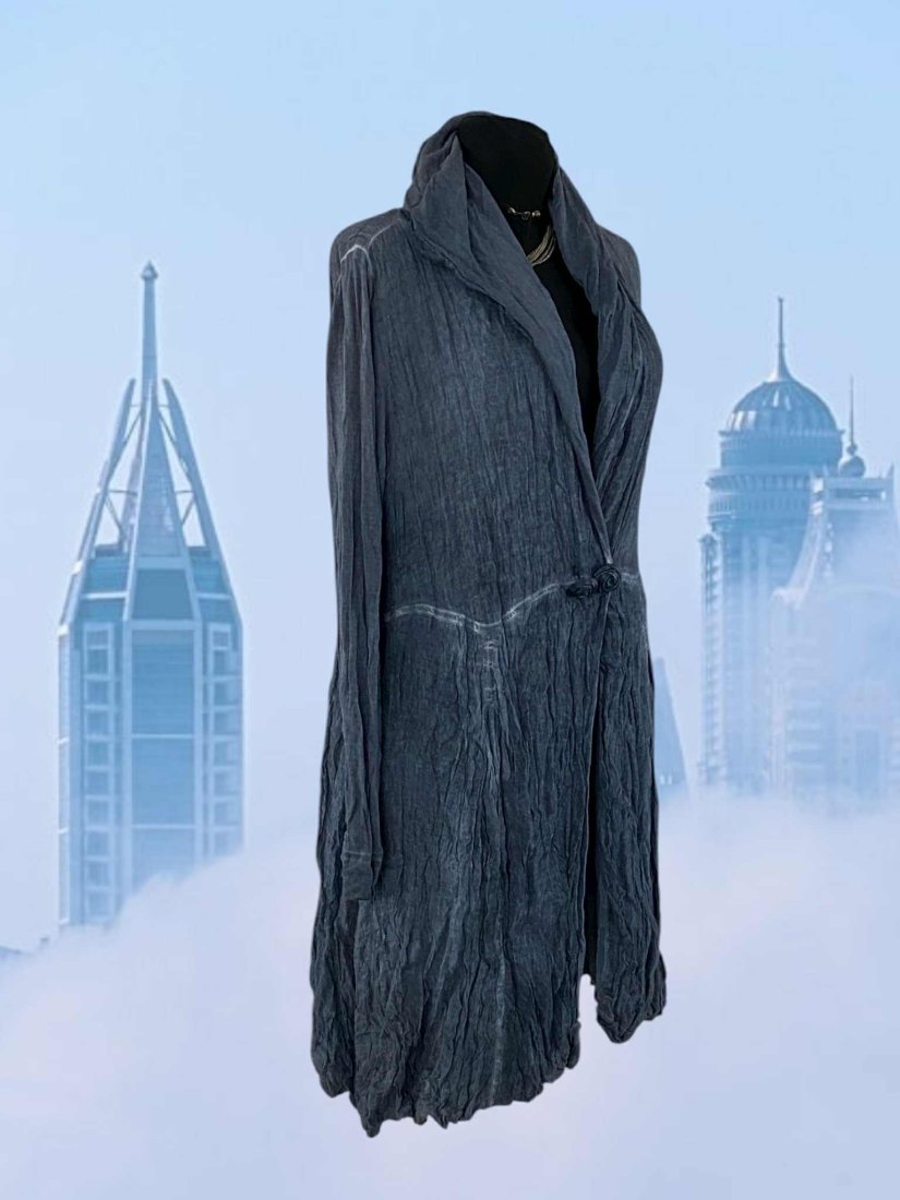 Kardigan / Płaszcz jest dwuwarstwowy. Oba materiały doskonałej jakości: zewnętrzny fajnie pognieciony. Podszewka i rękawy w dotyku jak cienka bawełna. Oba materiały w kolorze niebieskim "farbowany".