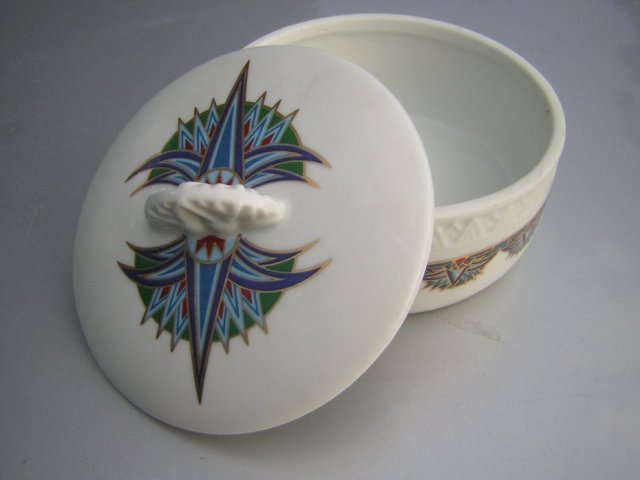Mocna,szlachetna biała porcelana na satynowo-blyszcząco wykończona. Ciekawe graficzne zdobienie. Wklęsły wzorek dookoła rantu części dolnej. Zdobienia w żywych barwach - niuanse niebieskości, ruda czerwień i zieleń. Złote delikatne obramówki wzoru.