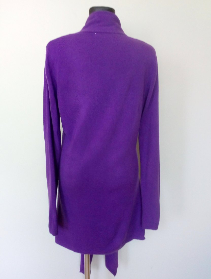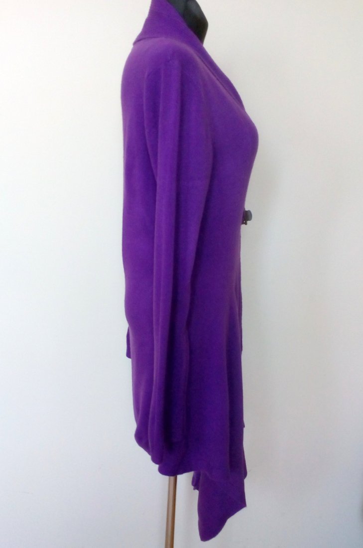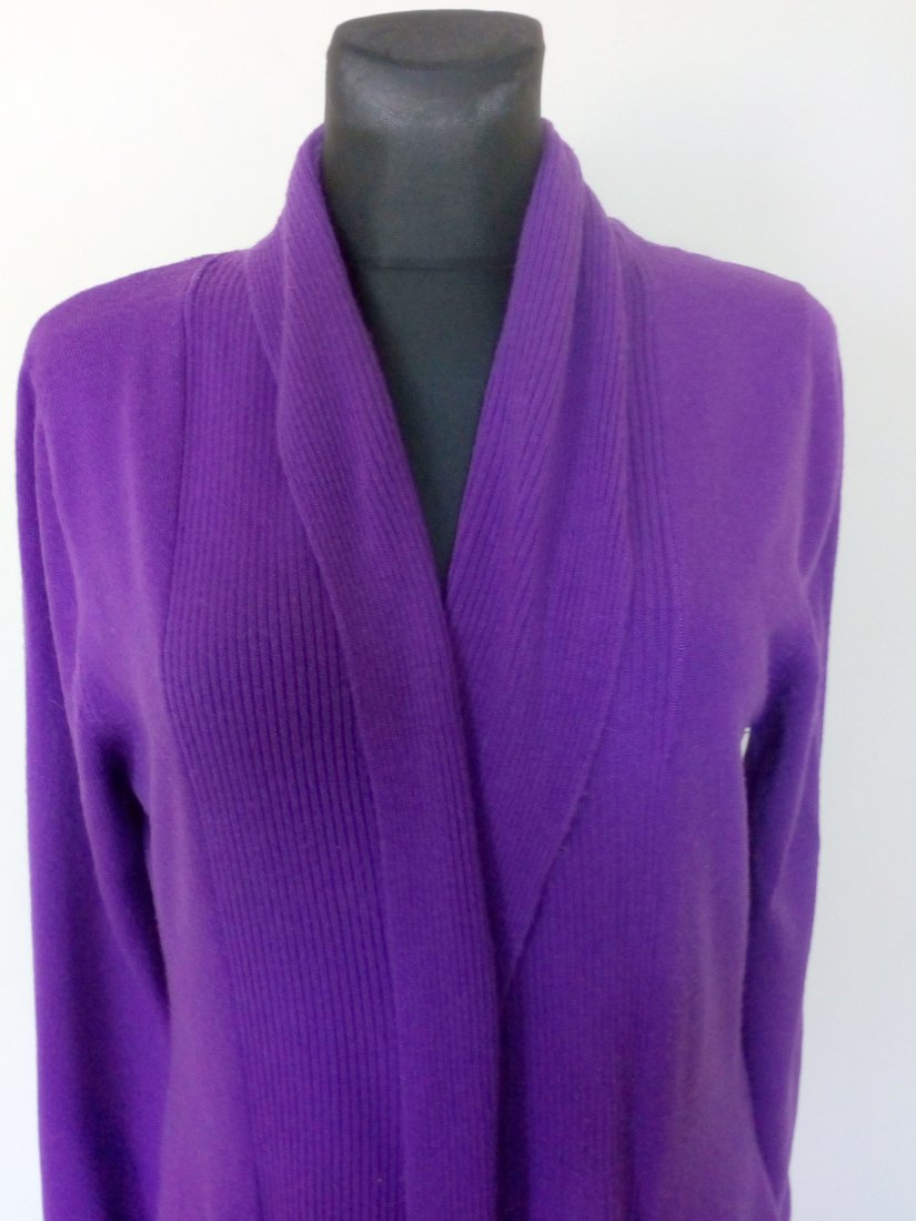 Długi, asymetryczny sweter z szalowym kołnierzem, fason bez zapięcia