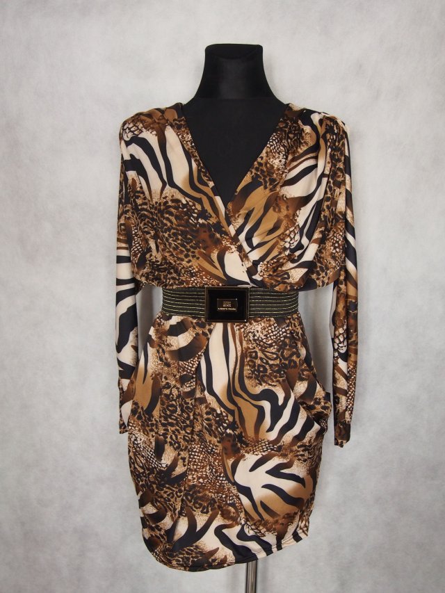 Sukienka marki Elizabetta Franchi. W modny panterkowy wzór. Niestety brak jakichkolwiek metek. Materiał śliski i mega delikatny w dotyku. Sukienki od tej włoskiej projektantki kosztują od 299euro. Zapinana na plecach, dwie kieszonki.