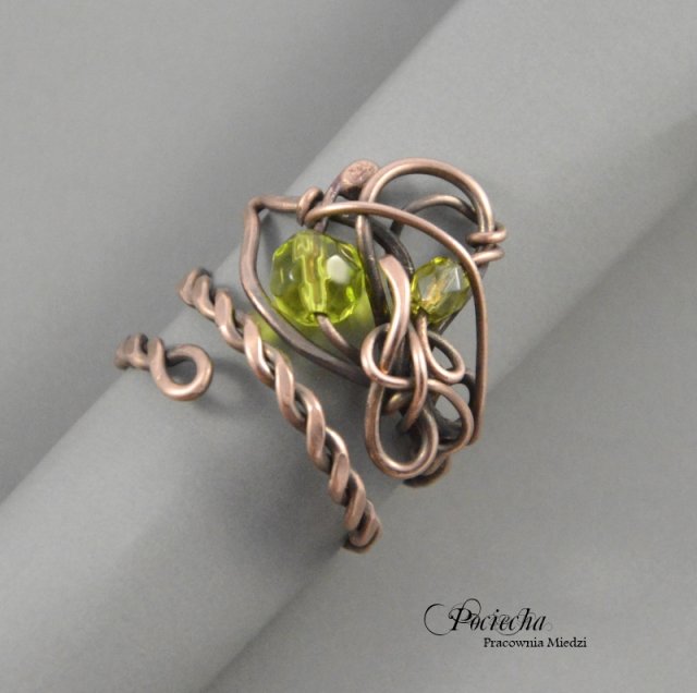 Asymetryczny pierścionek stworzony ręcznie z miedzi jubilerskiej. Ozdobiony pięknymi szklanymi kryształkami. Szkło został misternie oplecione miedzią. Pierścionek ma uniwersalny rozmiar i ciekawą bardzo wygodną formę sprężyny. Miedź została spatynowana i wypolerowana.Element ozdobny pierścionka ma wymiary ok. 1,8 x 2,4 cm. Projekt autorski. Polecam.