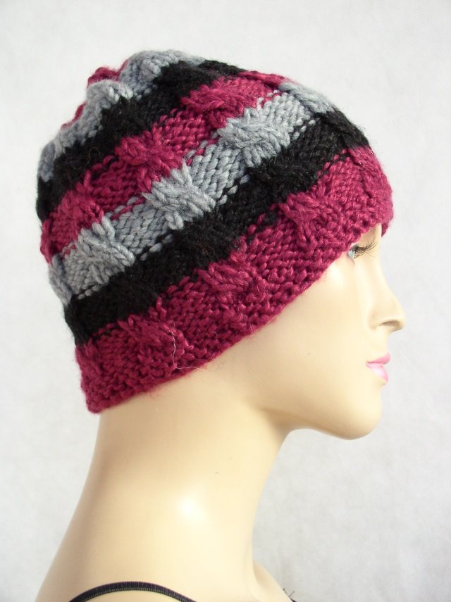 Ciepła czapka zimowa robiona ręcznie na drutach.Włoczka miękka z lekkim włoskiem w trzech kolorach:bordo,szary i czarny. Z tyłu zszywana.Stan bardzo dobry.Obwód 57 cm.