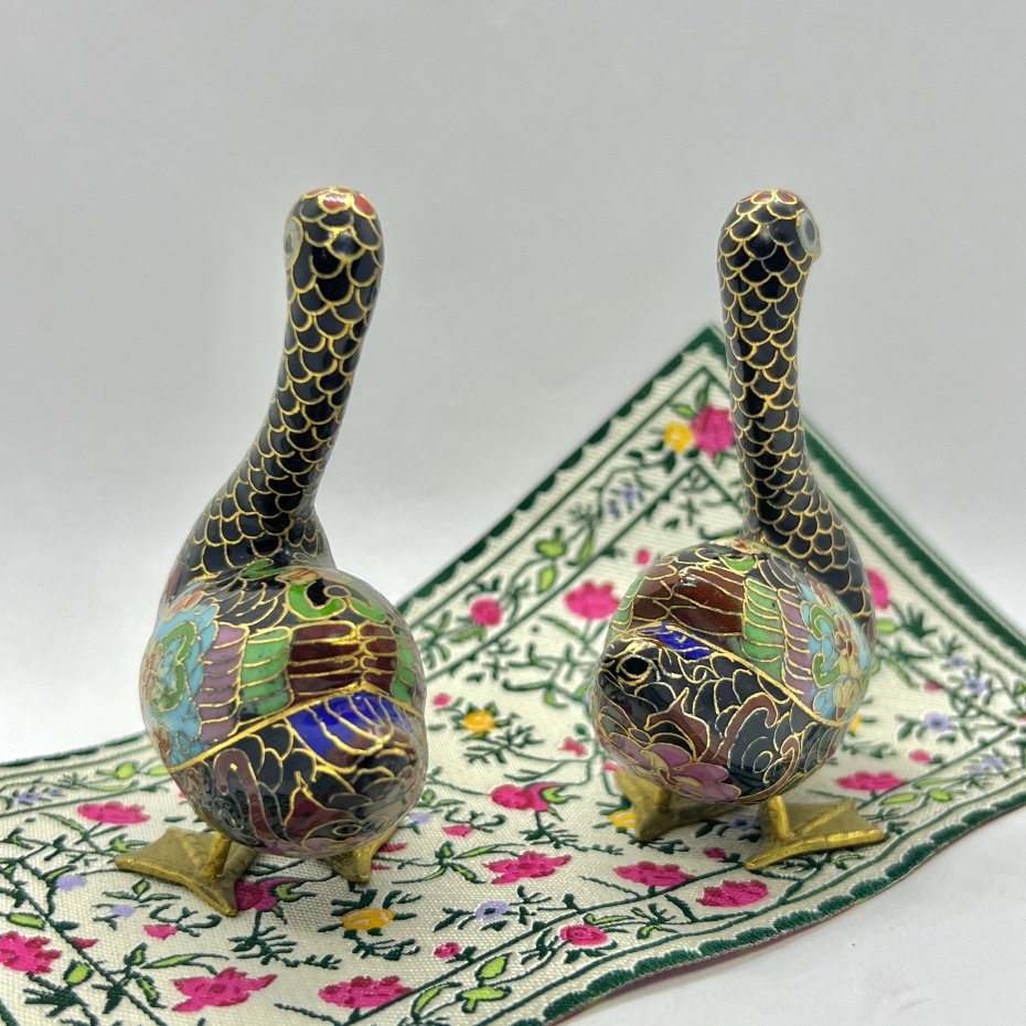Emalia Cloisonne - Zakochane kaczki ❤ Szlachetna sztuka emalii. Przedmioty wykonane w pracochłonnej technice emalii na złoconym metalu. Emalia ręcznie nakładana, misterium pracy. Wartościowe i bardzo interesujące w szczególności dla osób kolekcjonujących przedmioty dalekowschodnie.