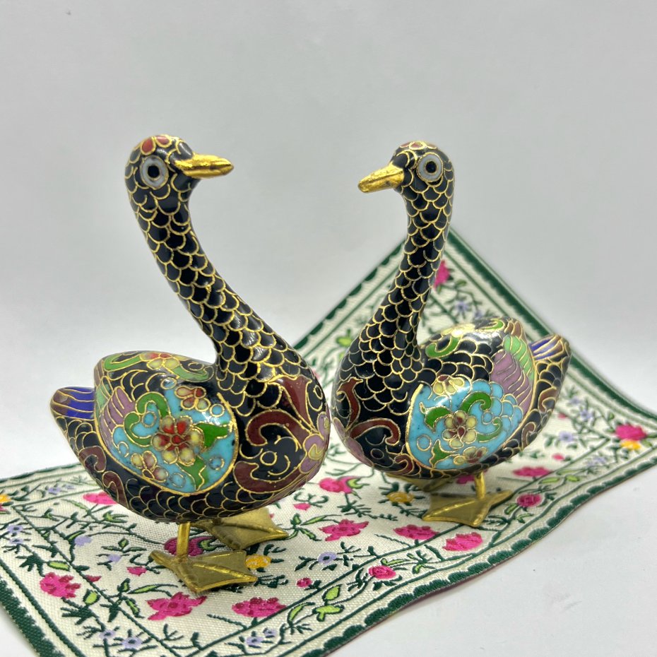 W tej ofercie kolekcjonerskie zakochane kaczki w emalii Cloisonne. Zachowane w stanie idealnym vintage, bez ubytków itp.