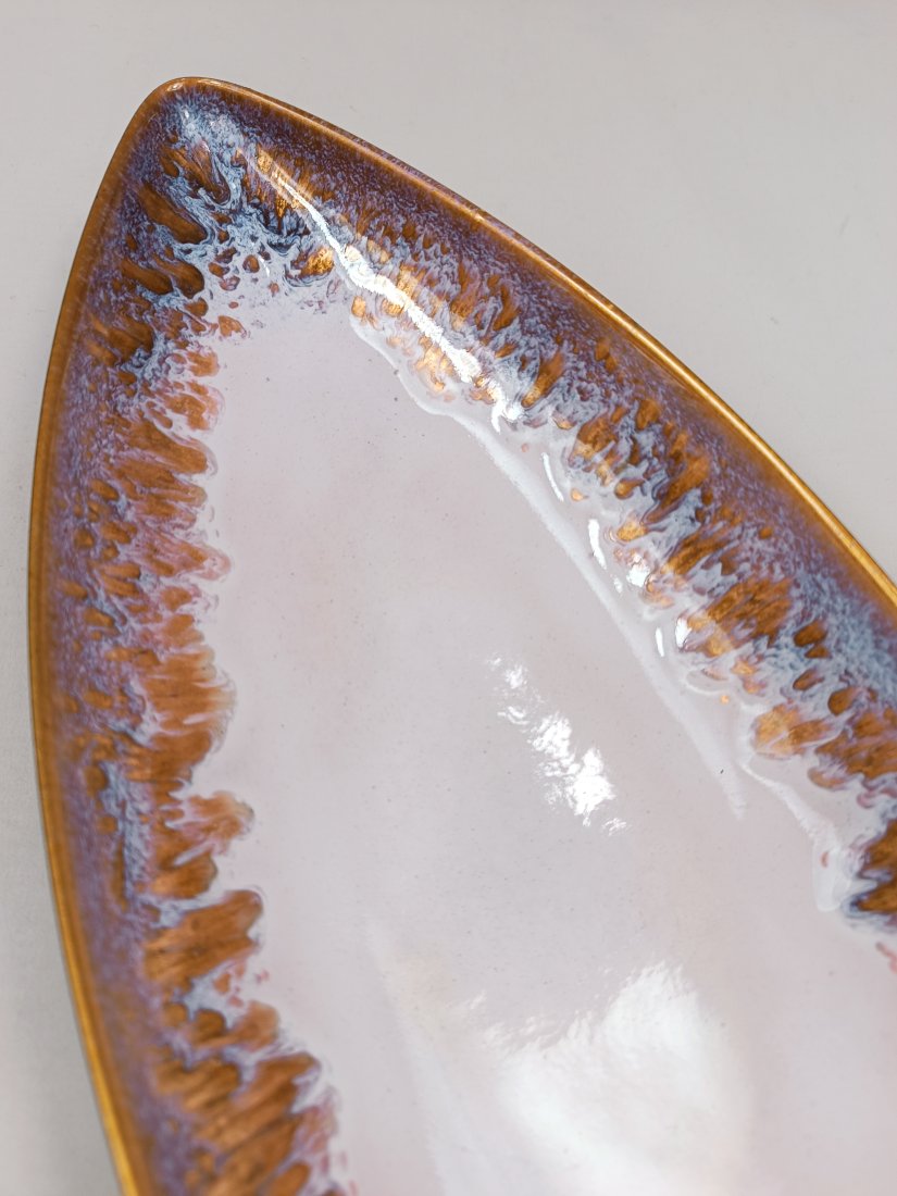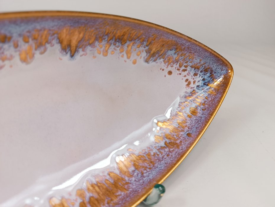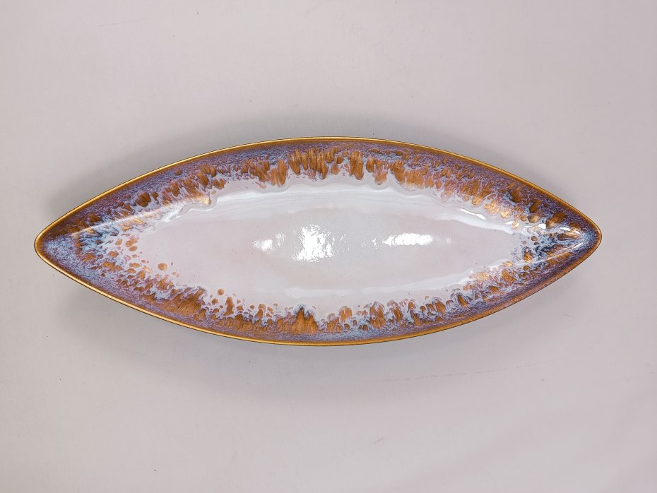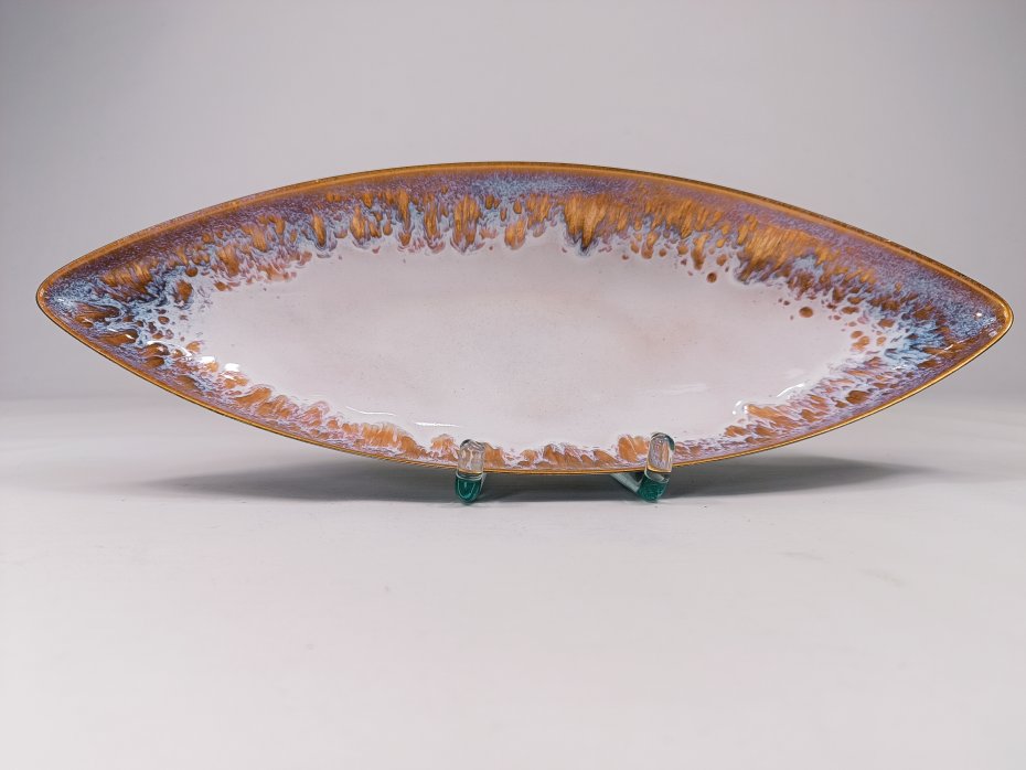 Emaliowana patera wyprodukowana w Niemczech w latach 60 przez Fischland. Na spodzie znajduje się wybita sygnatura w postaci rybki. Patera wykonana jest z miedzi pokrytej emalią nanoszoną ręcznie. Długość 38 cm.