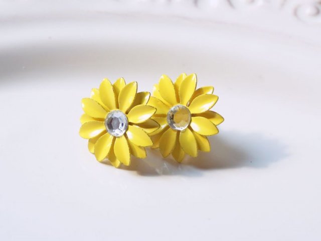 Emaliowane kolczyki sztyfty w kształcie żółtych kwiatów. W centralnym miejscu cyrkonia.