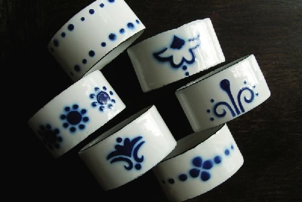 Bardzo ciekawe, rzadko spotykane metalowe emaliowane serwetniki. Ręcznie zdobione, i na każdym wzór inny :) Ozdoba stołu, na dodatek komplet 6 sztuk ! 6,5 x 3 x 2,5 cm. Stan zachowania bardzo dobry.
