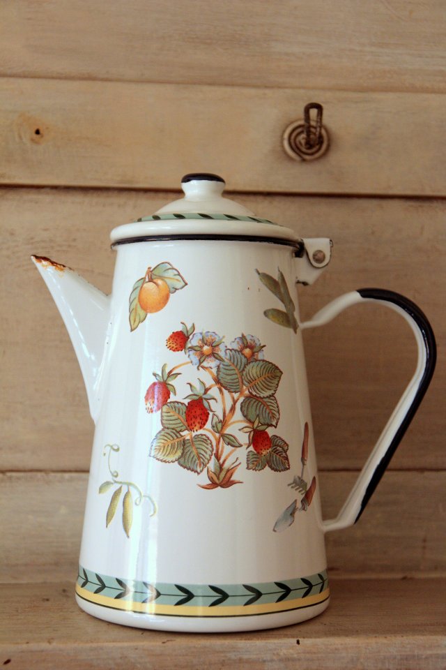 Fajny, biały, bardzo stary emaliowany dzbanek z uroczymi owocami. Oryginalny przedmiot Villeroy&Boch.