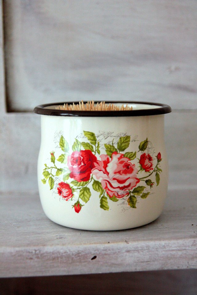 Kremowy emaliowany kubeczek z uroczymi różyczkami. Z rączką. Idealny do wnętrz w stylu country!