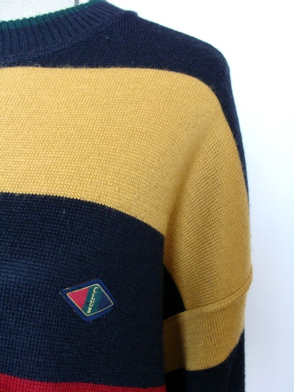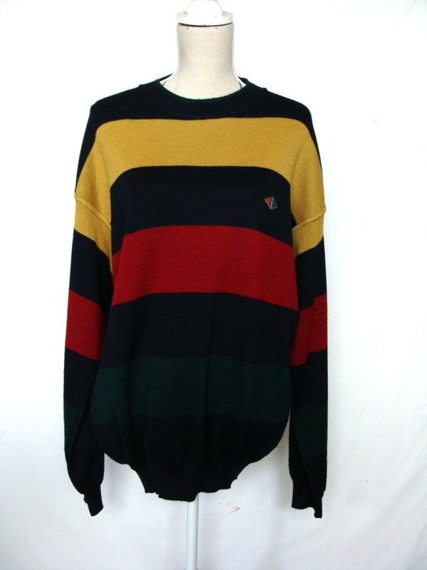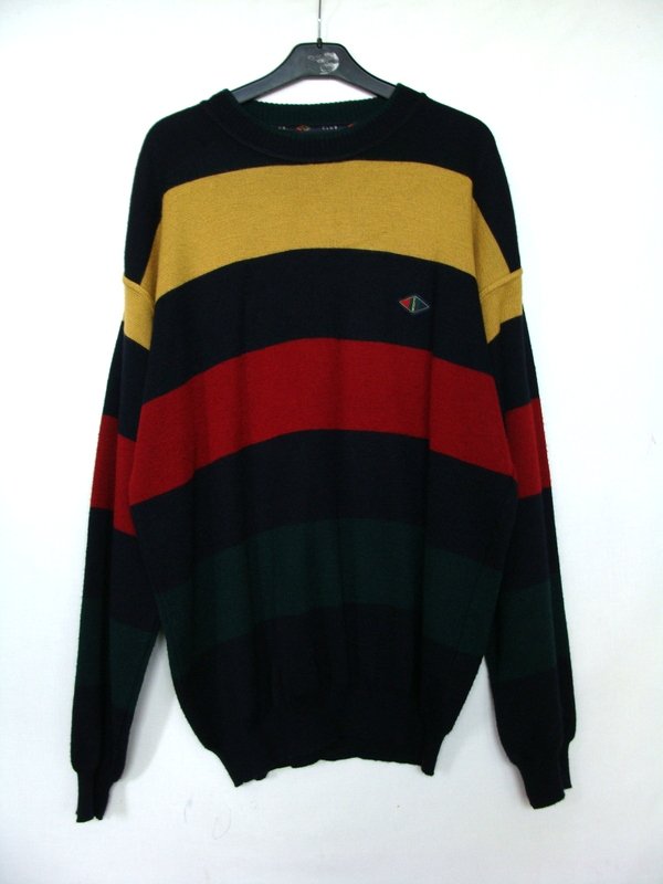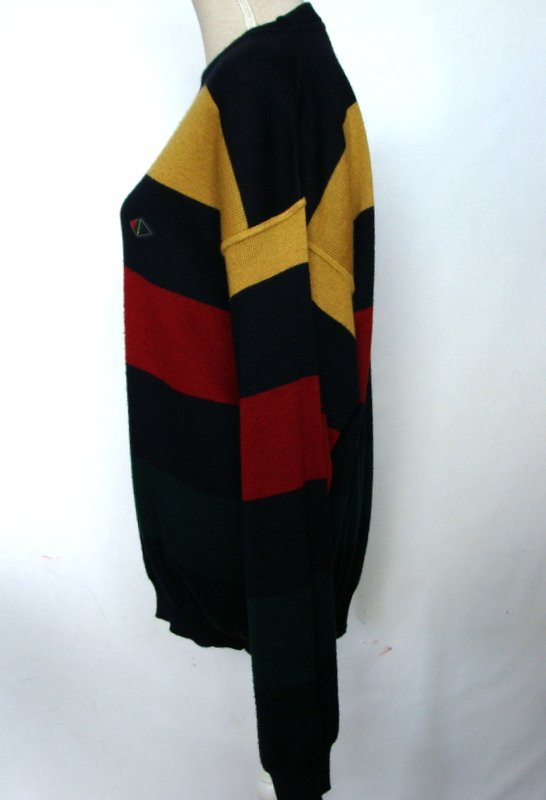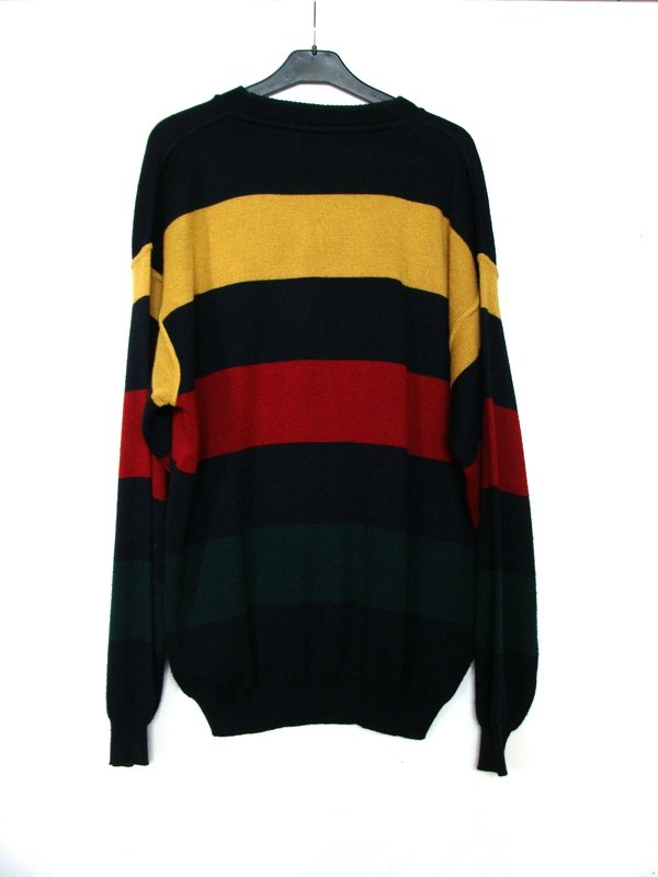 Włoski, męski sweter z wełny i akrylu w szerokie pasy w kolorach czerni, ciemnej zieleni, zgaszonej czerwieni i musztardowej żółci. Wykończony ściągaczami.