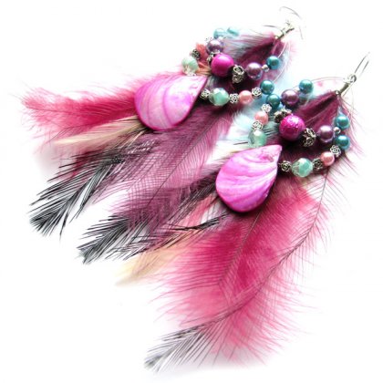 Niezwykle lekkie kolczyki wykonane z mieszanki piór: piór kogucich, puszystych piórek marabuta oraz piórek EMU. Materiały: piórka, szklane korale, korale spectra, perły, masa perłowa, metalowe przekładki zawieszone na lince jubilerskiej, srebrne bigle. Długość kolczyków bez bigli 13 cm, długość koralików zawieszonych na lince 8 cm.