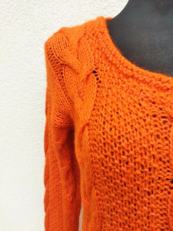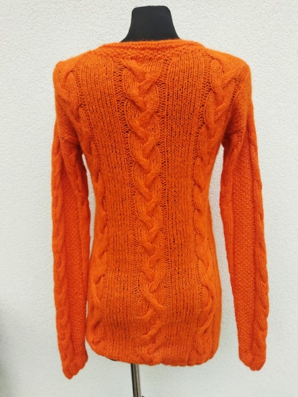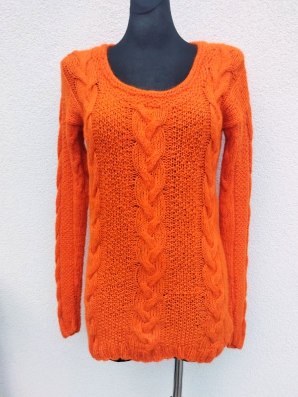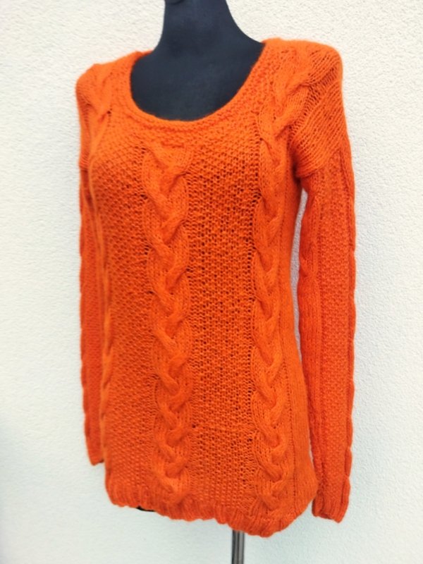 Miły, mięciutki sweter z włóczki w oranżowym kolorze, dziergany na drutach z warkoczowym wzorem. Owalny dekolt . Wykończony ściągaczami. Podatny i rozciagliwy.