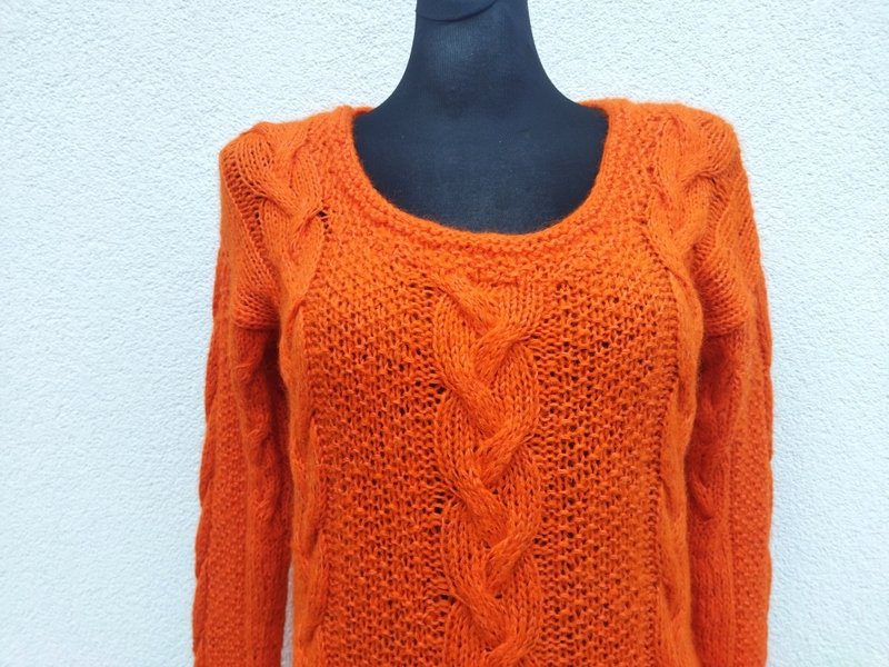 Miły, mięciutki sweter z włóczki w oranżowym kolorze, dziergany na drutach z warkoczowym wzorem. Owalny dekolt . Wykończony ściągaczami. Podatny i rozciagliwy.