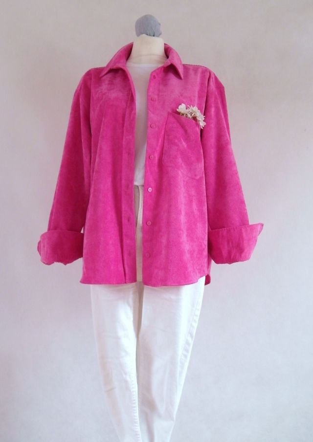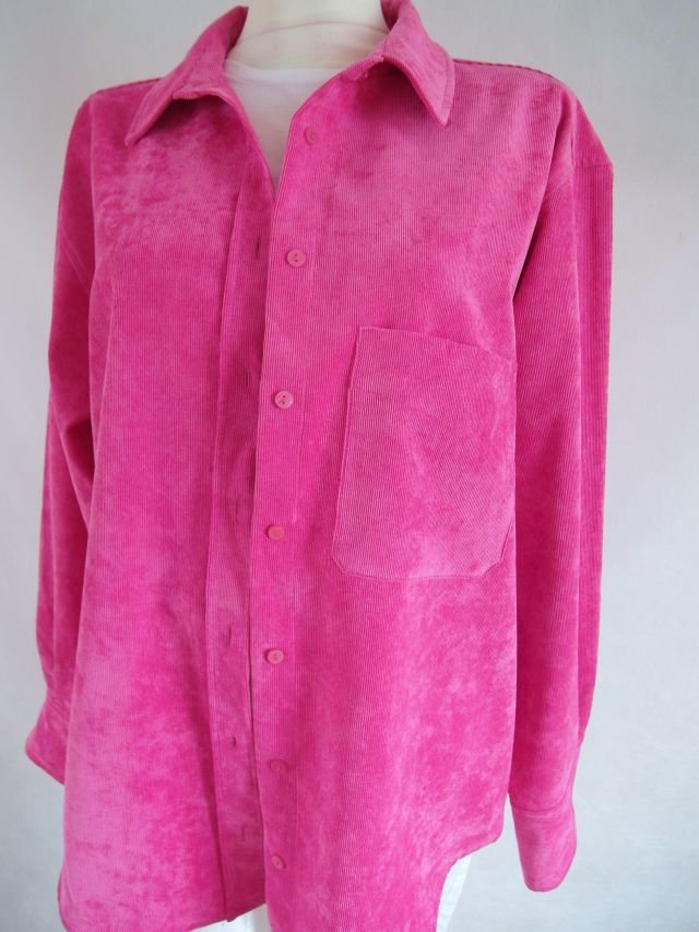 kolor intensywny różowy, z przodu kieszonka, mankiety z guzikami, tył delikatnie dłuższy.świetna na wyjazdy, urlop.Bardzo miła w dotyku, stan idealny.
