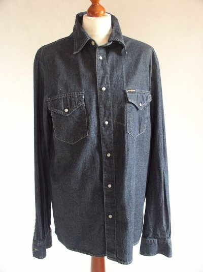 Męska koszula dżinsowa firmy ENERGIE.Rozmiar L.Materiał bawełna.Kołnierz na stójce.Zapinana z przodu na ozdobne napy.Na piersiach naszyte dwie kieszenie z klapką,zapinaną na nap.Rękaw długi,zakończony mankietem + guzik.Stan bardzo dobry.Długość 73 cm.pod pachami 114 cm.