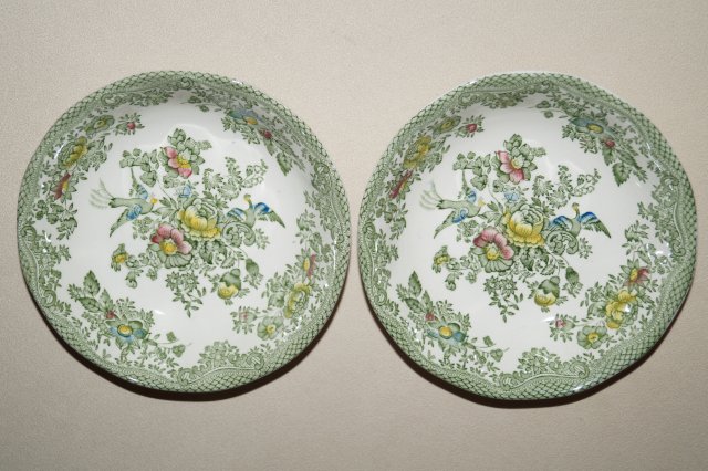 Para miseczek deserowych/na owoce/bakalie sygnowanych WEDGWOOD TUNSTALL z kultowej serii ORIENTAL PHEASANTS/ zielone, szkliwione na błyszcząco, ręcznie zdobione charakterystycznym motywem, do kolekcji ale również w pełni użytkowe