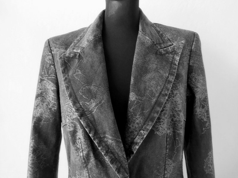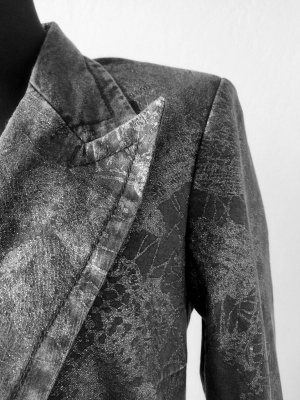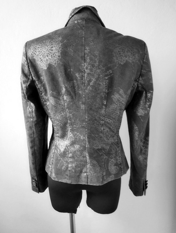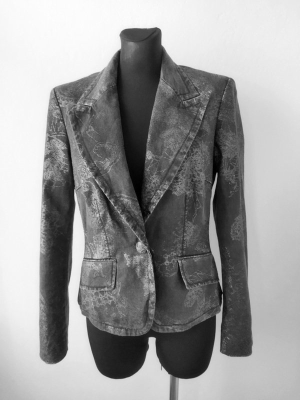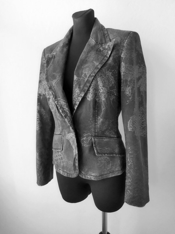 Efektowna , zgrabna marynarka z ciemnoszarej bawełnianej jeansowej tkaniny pokrytej srebrno brokatowym roślinnym nadrukiem. Taliowana, z kołnierzem z rewersami , z dwiema wpuszczanymi kieszeniami z patkami. zapinana na jeden guzik. na podszewce. Ładniejsza w realu.