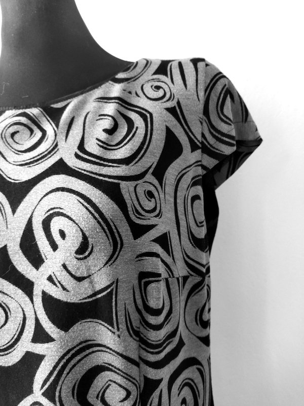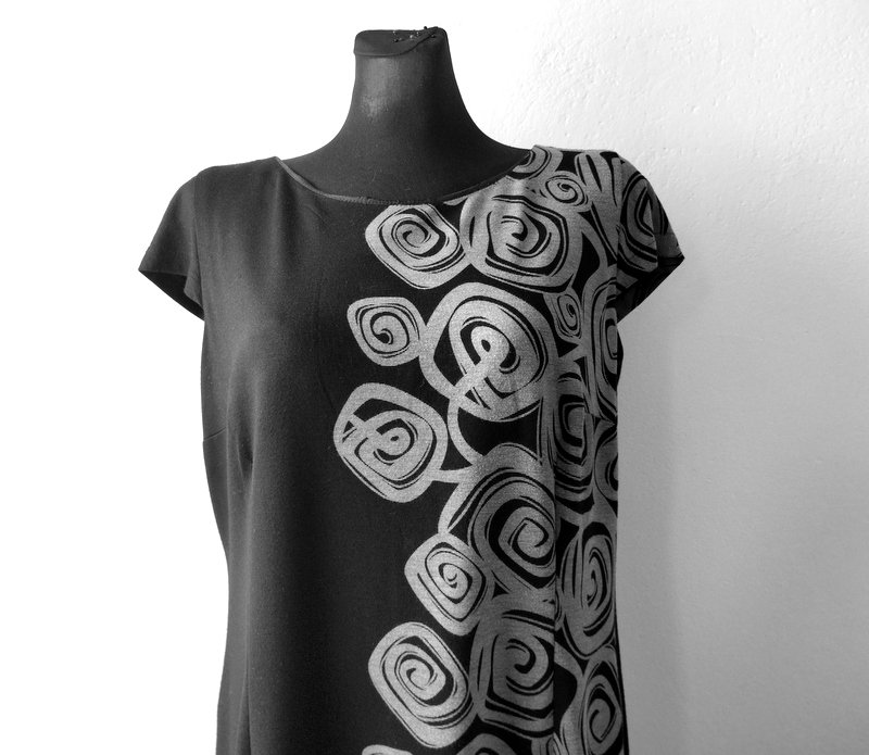 Ołówkowa sukienka z wiskozowej tkaniny dzianinowej z dodatkiem poliestru i elastanu w czarno - szarej kolorystyce. Zapinana z boku na zamek, z tyłu u dołu rozcięcie. Podszewka w górnej części