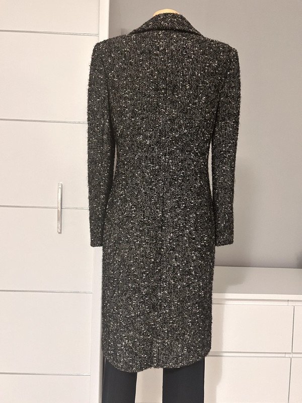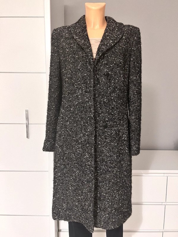 Płaszcz marki Episode, rozmiar z metki to M 38. Posiada świetny skład, bo jest wykonany 75% wełny, 16% alpaki i 100% acetatu. Dzięki temu jest bardzo ciepły. Na zdjęciach pokazałam wady, czyli lekkie rozprucia, nie przeszkadzają podczas użytkowania i spokojnie można je zszyć. Cena katalogowa to 2 500 zł.
