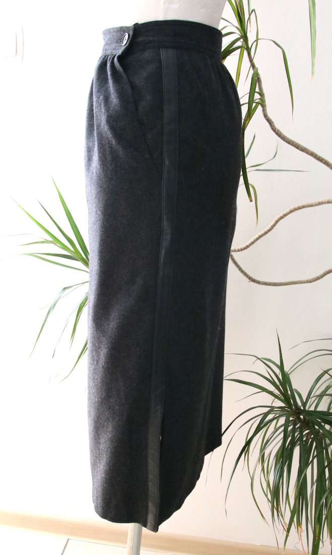 Szara spódnica midi, Escada, w kolorze szarym, wykonana z wysokiej jakości wełny, ze skórzanymi paskami po bokach spódnicy, kieszenie Zapinana z boku na zamek. Rozporek z boku, na całóści podszewka