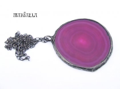 Serdecznie zapraszam do spojrzenia na wyjątkowy wisior wykonany z agatu. Długość wisiorka razem z oczkiem około 11 cm, szerokość 9 cm. Trwałe wykończenie witrażowe. Używam wyłącznie ekologicznej, bezołowiowej cyny. Prawdziwy rarytas :-) Pojedynczy projekt! Zapraszam! MARIAELA
