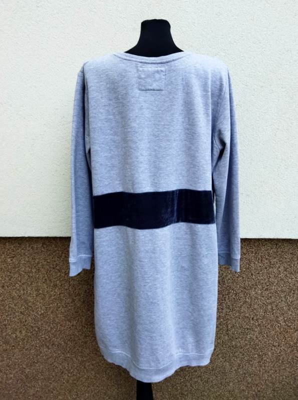 Miła, miękka i wygodna sukienka z dresowej tkaniny w szarym kolorze z granatową welurowa wstawką i białymi napisami. Luźny oversizowy fason w formie długiej bluzy , z kangurkową kieszenią. Wykończona dzianinowymi ściągaczami.