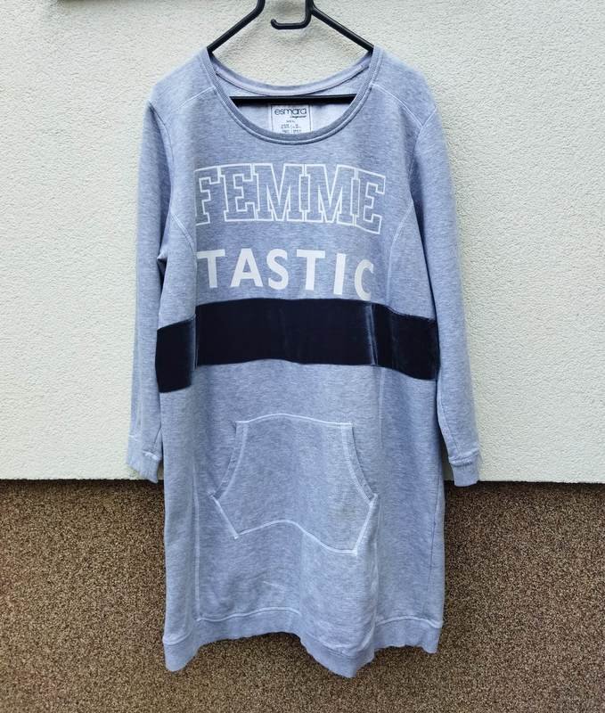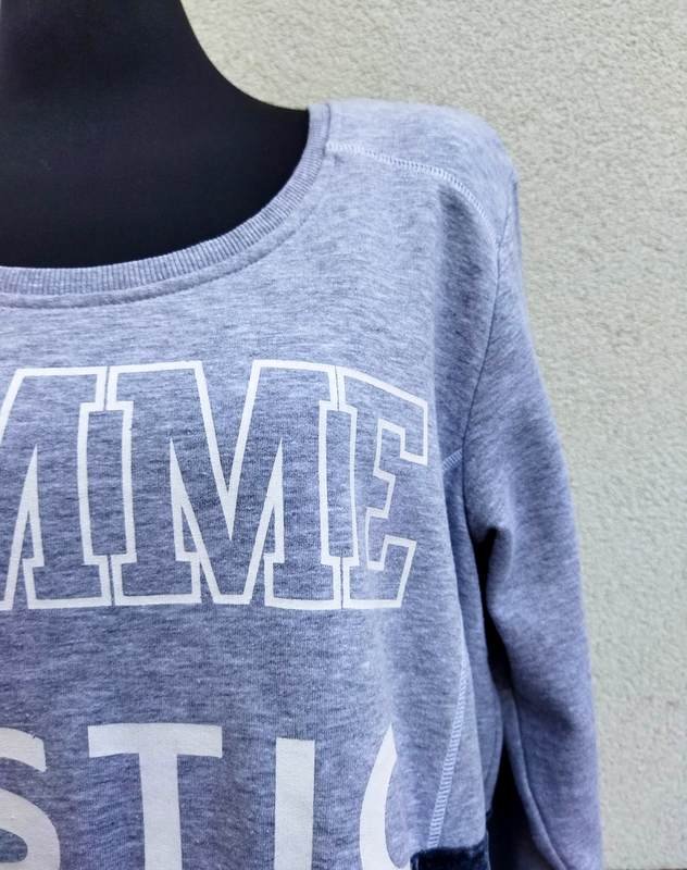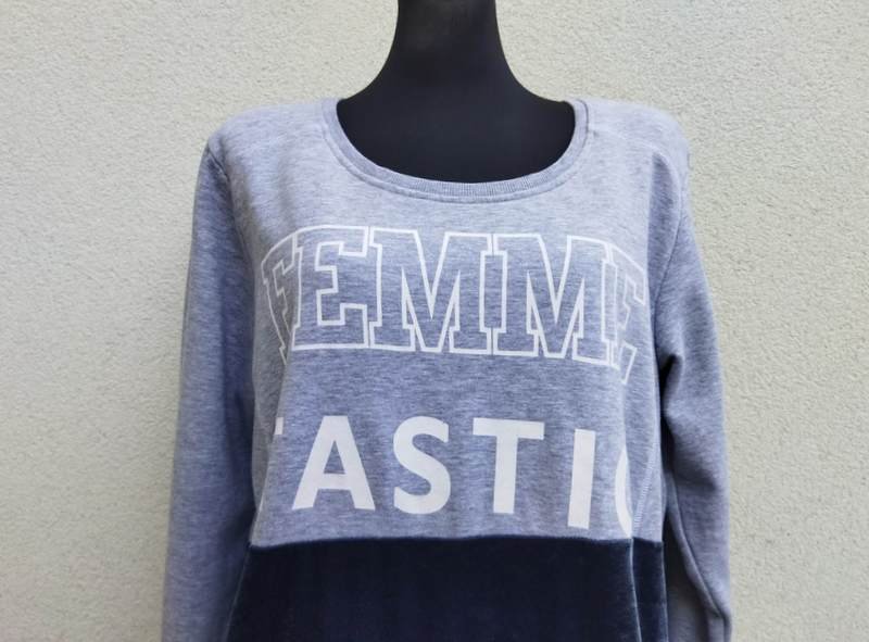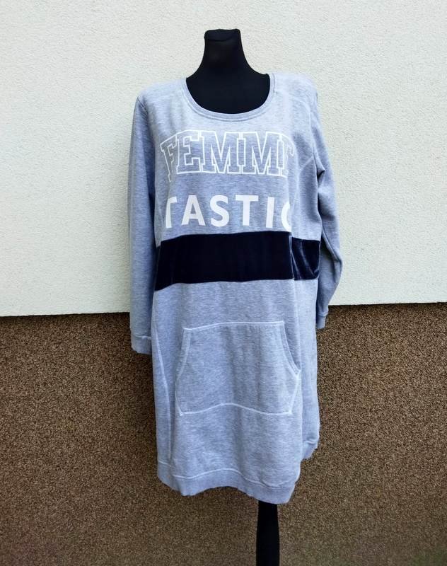Miła, miękka i wygodna sukienka z dresowej tkaniny w szarym kolorze z granatową welurowa wstawką i białymi napisami. Luźny oversizowy fason w formie długiej bluzy , z kangurkową kieszenią. Wykończona dzianinowymi ściągaczami.