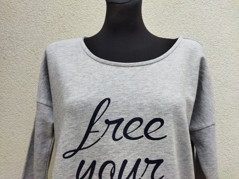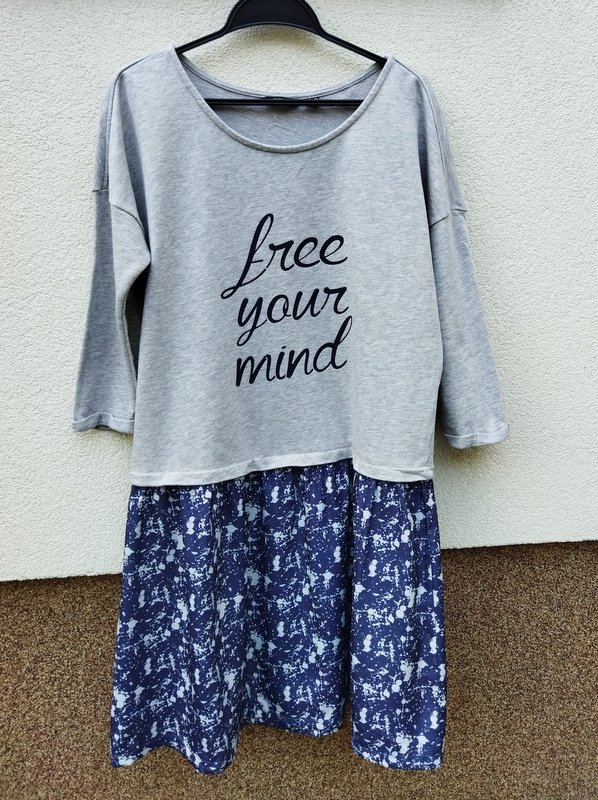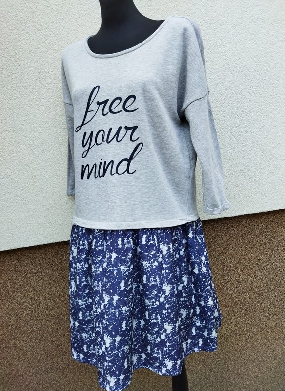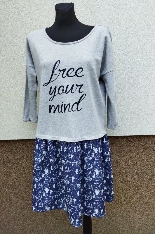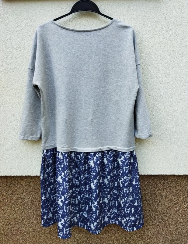 Sukienka z łączonych materiałów; góra z bawełnianej dzianinowej tkaniny dresowej w jasno szarym kolorze , dół z wzorzystej tkaniny poliestrowej w granatowo-białe wzorki. Luźny fason z owalny dekoltem, rękawy niżej doszywane.