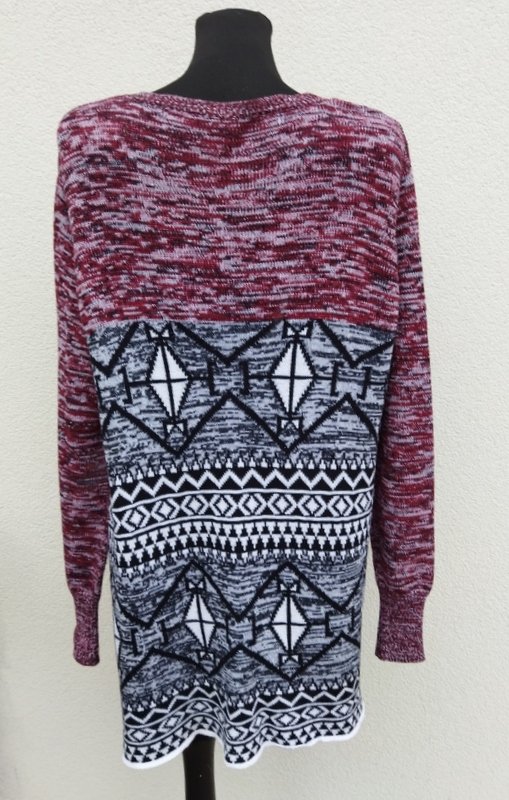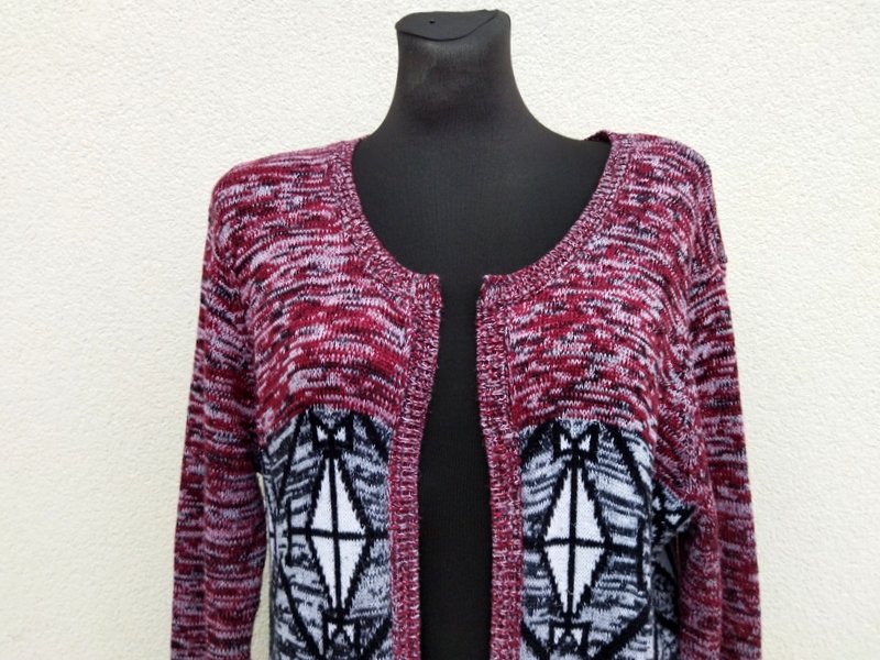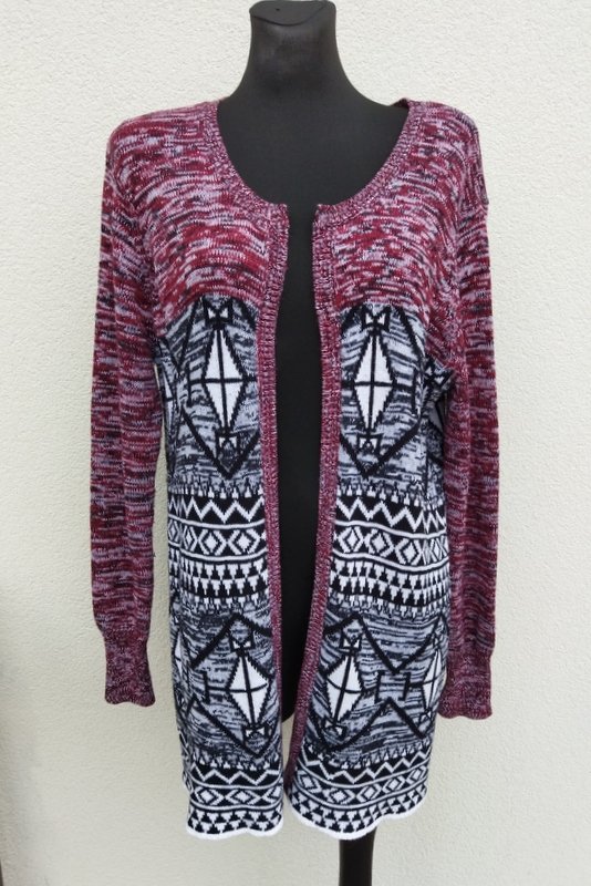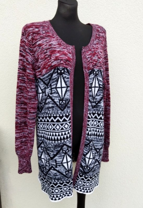 Dłuższy wzorzysty sweter typu kardigan w w melanżowej kolorystyce burgundu, czerni i bieli z biało-czarnymi wzorami. fason otwarty - bez zapięcia.