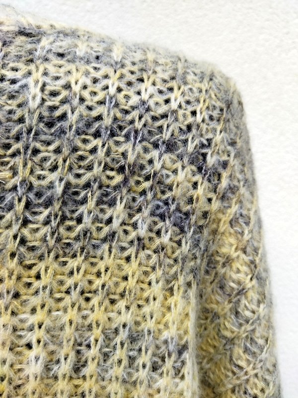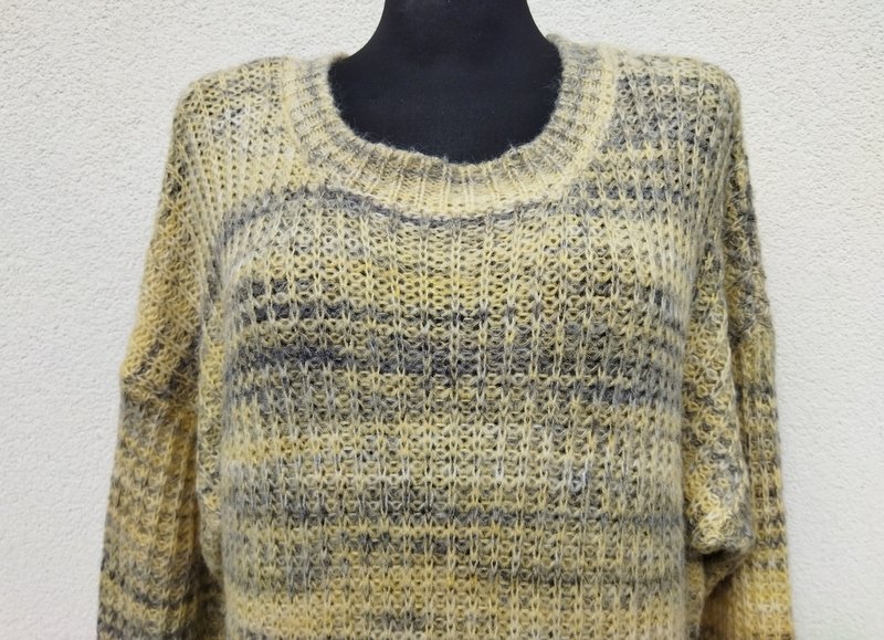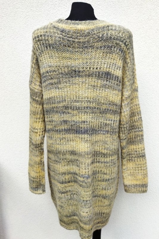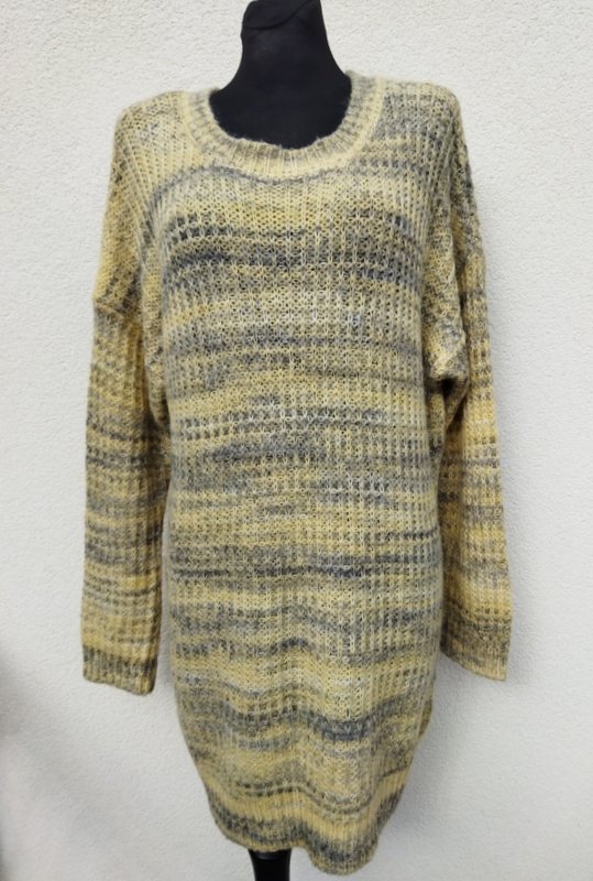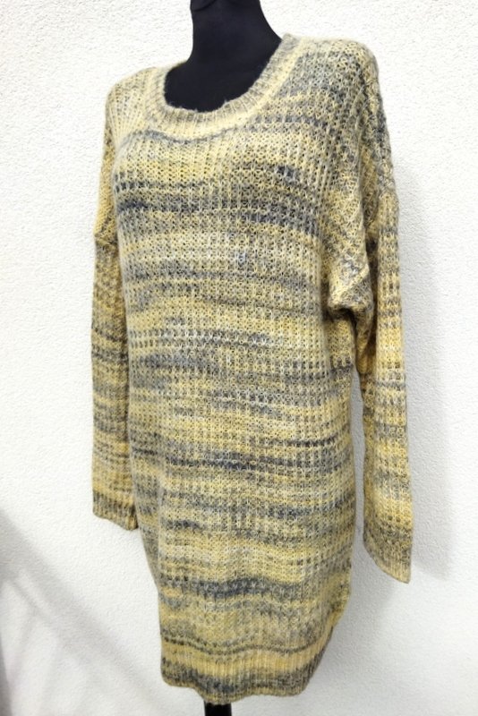 Przemiła, mięciutka dzianinowa sukienka w melanżowej kolorystyce waniliowej żółci i szarości. Swobodny luźny fason z obniżona linia ramion , z owalnym dekoltem. Podatna i rozciągliwa