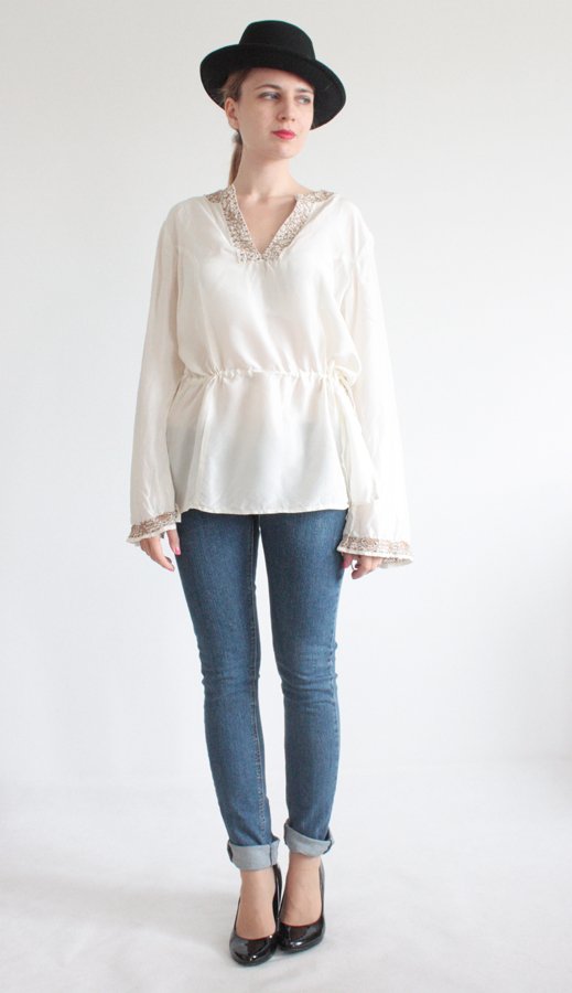 Piękna bluzka w kolorze ecru wykonana z delikatnego, 100%-owego jedwabiu. Dekolt i mankiety ozdobione subtelnymi, drobnymi koralikami. W talii ściąganie troczkiem w tunelu.
