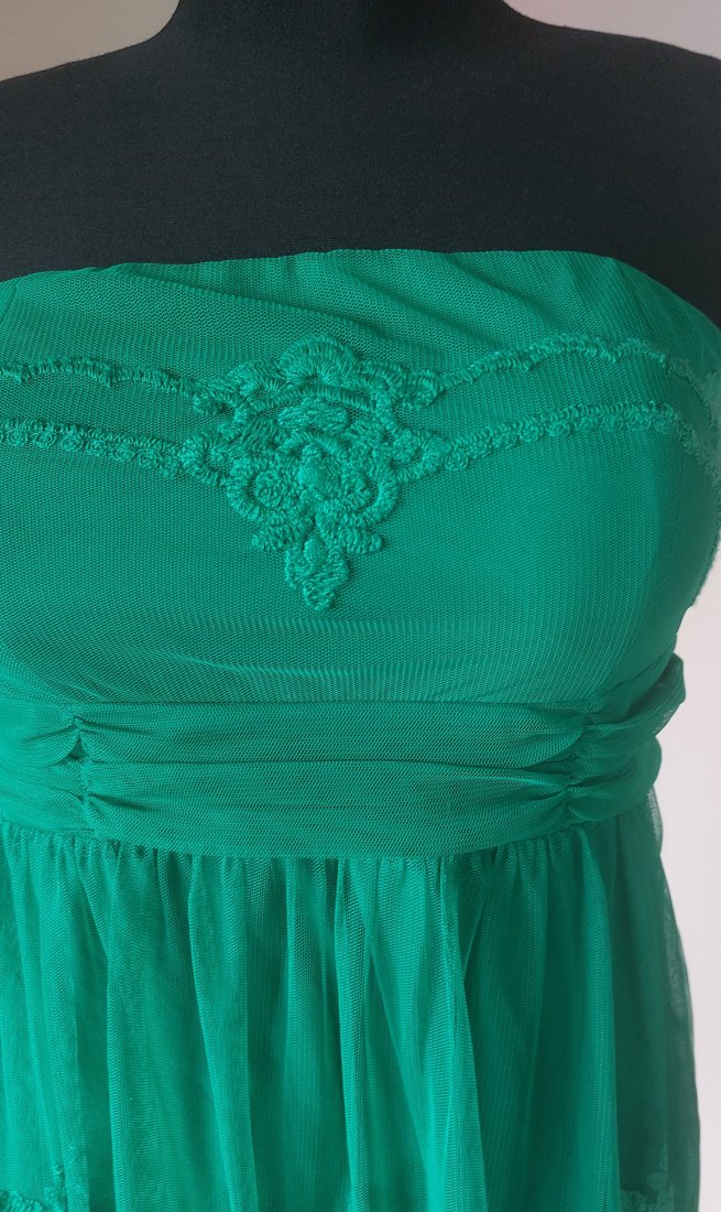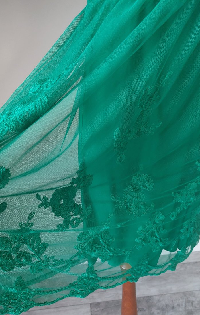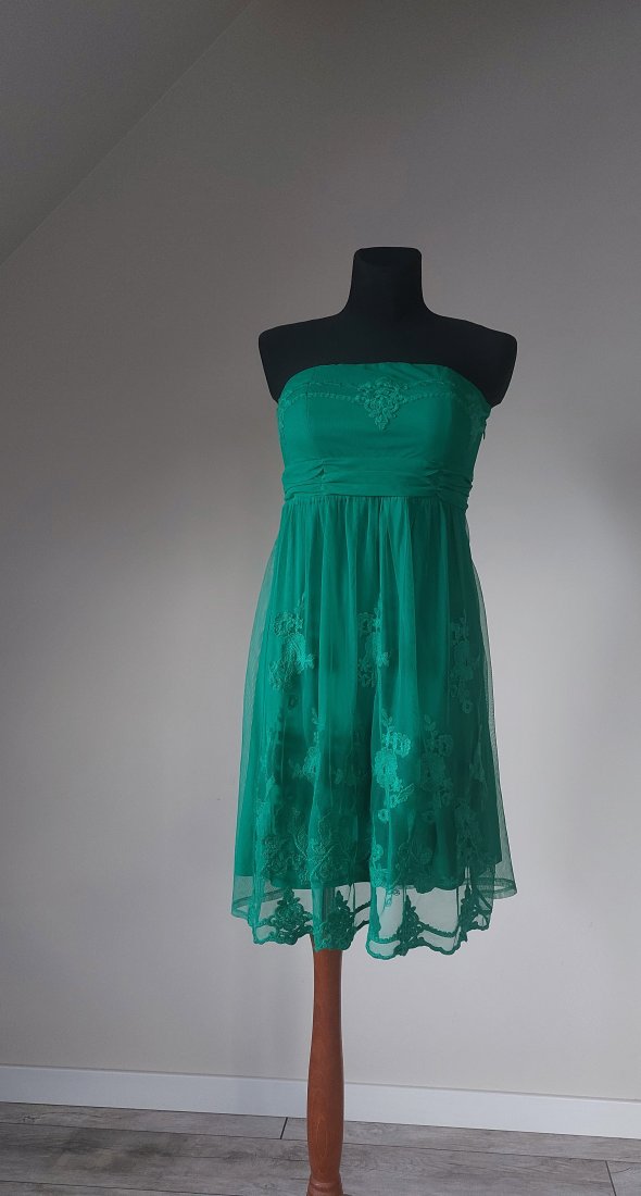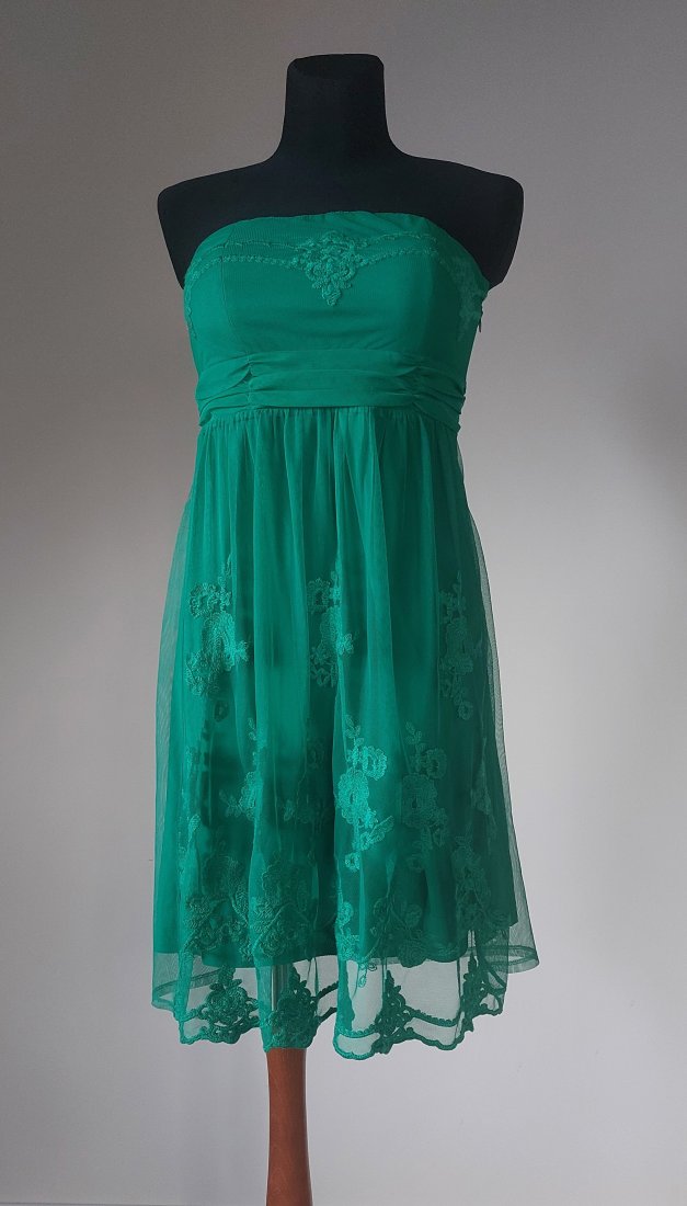 Koronkowa sukienka marki Esprit , nowa z defektem, zaciągnięcia z boku sukienki, wewnątrz podszewka, zapięcie na zamek Rozmiar S. Długość od pachy 75 cm, szerokość pod pachami 38 cm, szerokość pod biustem 36 cm.