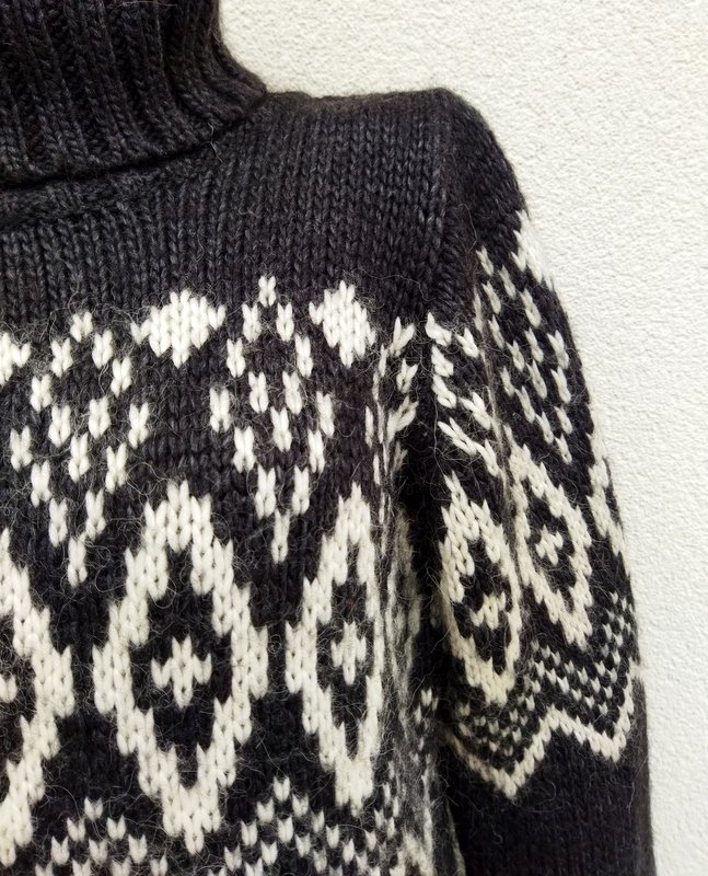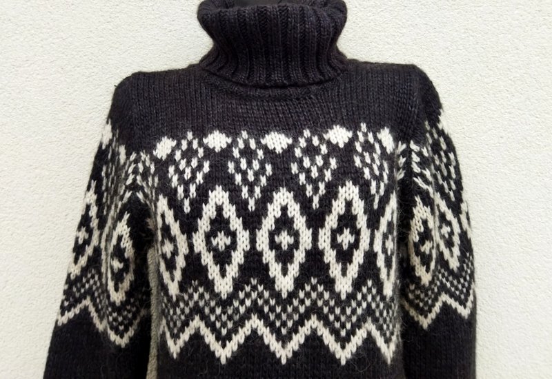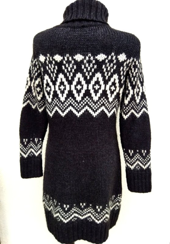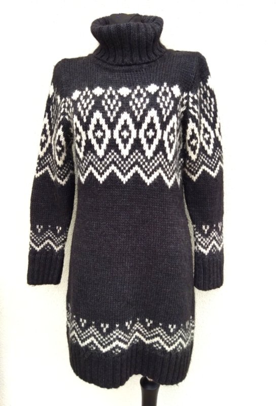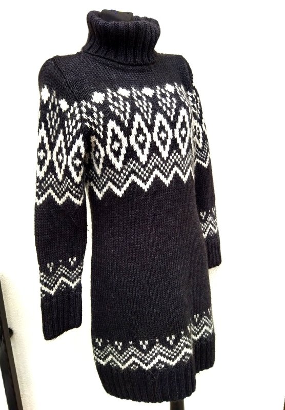 Ciepła sukienka z dobrej jakości grubszej ale miękkiej włóczki w grafitowej czerni z wzorami w białym kolorze. lekko taliowana, z luźnym golfem. Wykończona ściągaczami . Podatna i rozciągliwa
