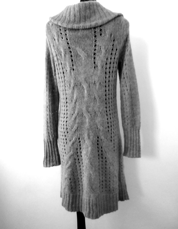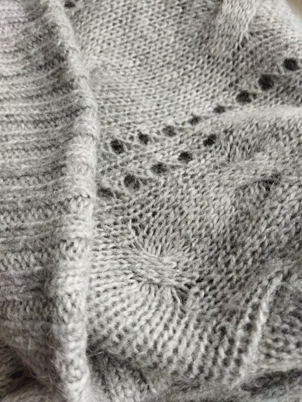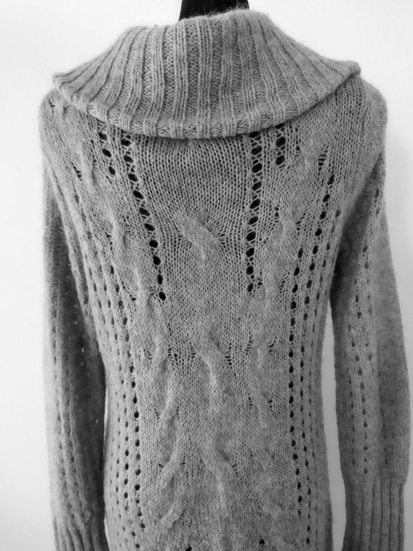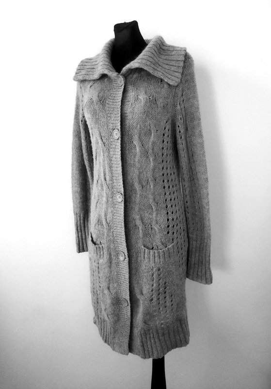 Dłuższy rozpinany sweter z włóczki o dobrym składzie jakościowym w jasnoszarym kolorze, wykonany ozdobnymi ściegami częściowo ażurowymi. Z kołnierzem , z dwiema wpuszczanymi kieszeniami. zapinany na sygnowane guziki w kolorze swetra. Wykończony ściągaczami. Ciepły, miękki i bardzo lekki. Ładniejszy w realu.