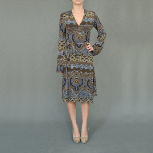Kopertowa sukienka od ESPRIT w stonowanych kolorach brązu i niebieskiego w etniczne wzory.