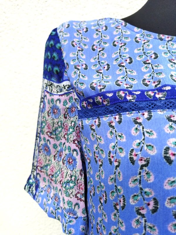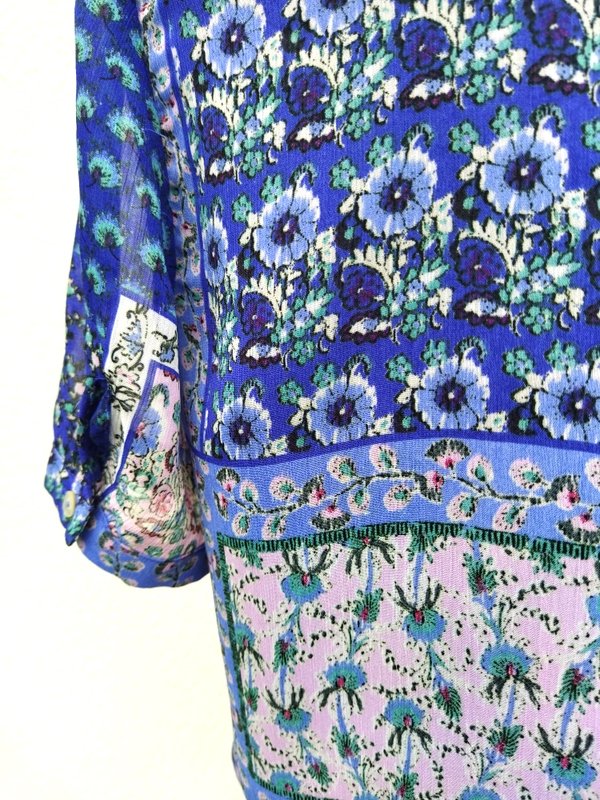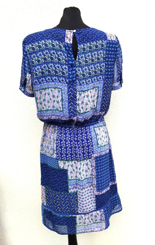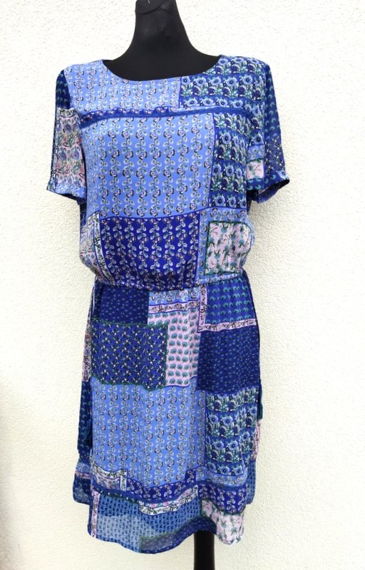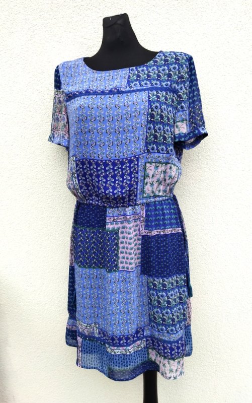 Sukienka z cienkiej żorżety poliestrowej w patchworkowe kwiatowe wzory z dominacją odcieni koloru niebieskiego od błękitu po nasycony kobalt, weneckiego różu, zieleni i czerni. W talii wciągnięta guma po bokach troczki z ozdobnymi chwostami. Zapinana z na plecach na guziczek. Na podszewce.