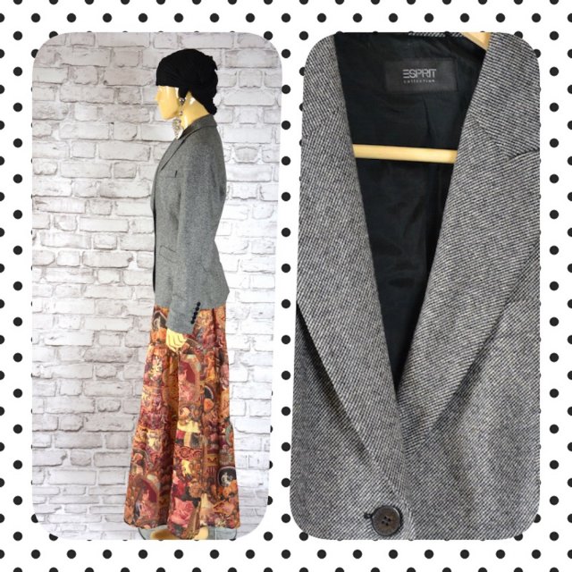 Szara marynarka marki Esprit w delikatną jodełkę,bardzo ładnie skrojona, delikatnie taliowana na podszewce, w ramionach poduszki, zapinana na logowane guziki, po bokach kieszonki, z tyłu rozcięcie. Na rękawach ala obramowania łatek.