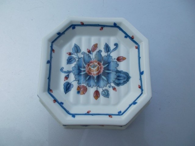 Piękna i nie często spotykana rzecz z kolekcjonerskiej serii porcelany sygnowanej ESTEE LAUDER PORCELAIN z 1979 roku. Z założenia mydelniczka na okrągłe mydełko z wewnętrznymi ryflowawaniami na wodę. Ośmiokątna wykwintna forma i eleganckie zdobienie. Porcelana, mocna, gruba...łazienkowo-użytkowa. Piękne zniuansowanie barw i satynowo błyszczące wykończenie. Użytkowa i ozdobna nie tylko zgodnie z założeniem przeznaczenia ;) Na biżury i do kuchni również.