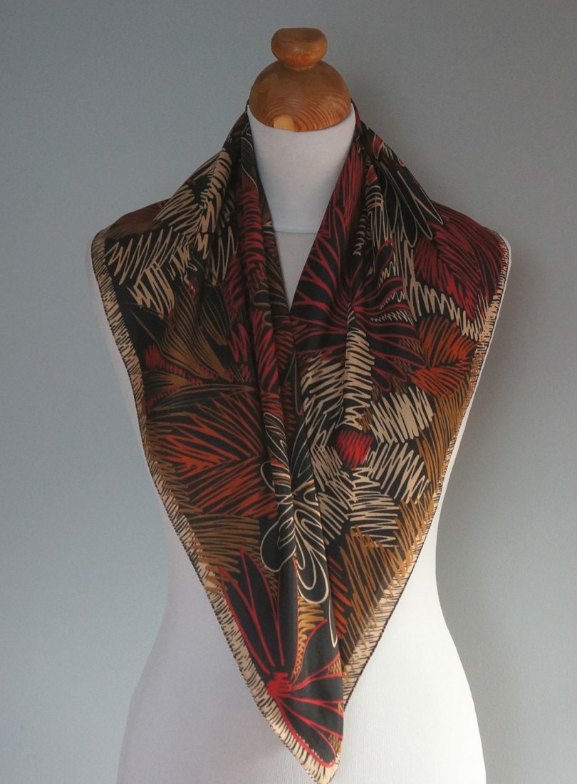 Kwadratowa apaszka. Delikatna tkanina satynowa. Ładna kolorystyka. Stan dobry.