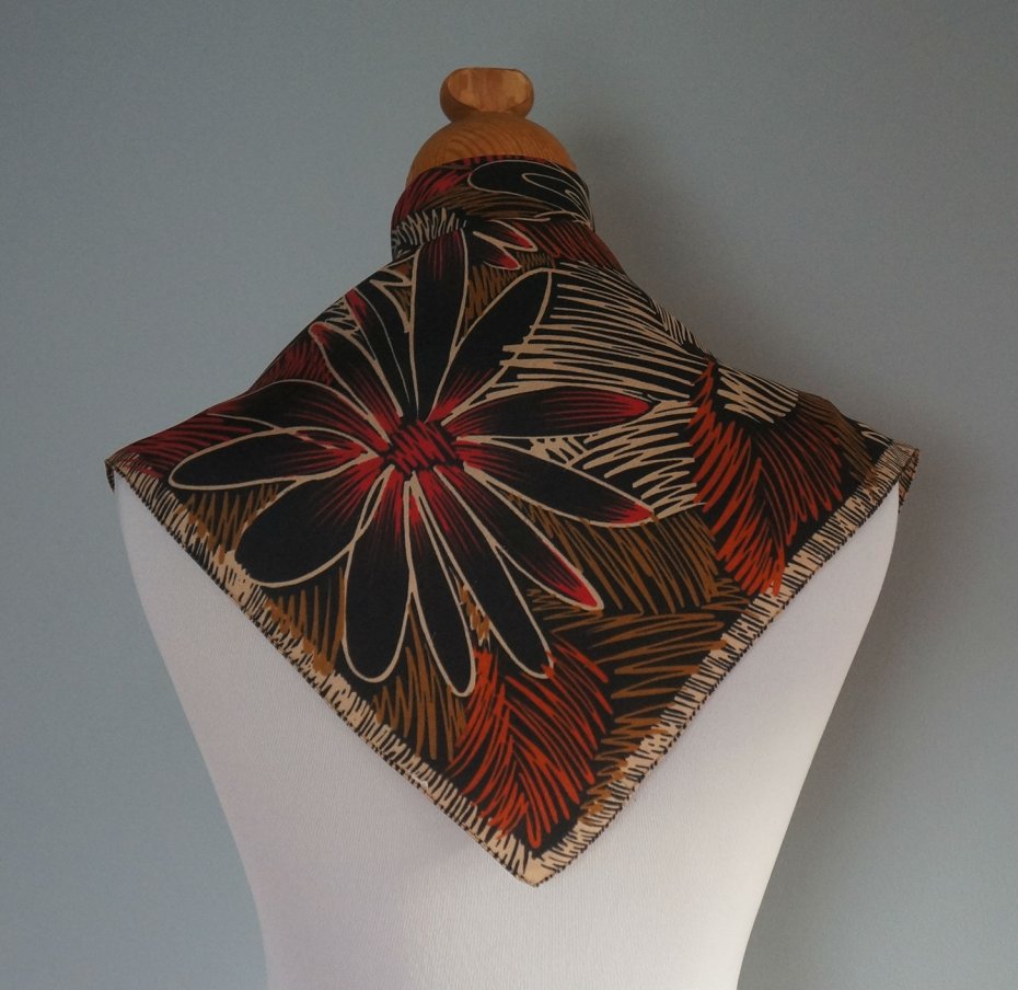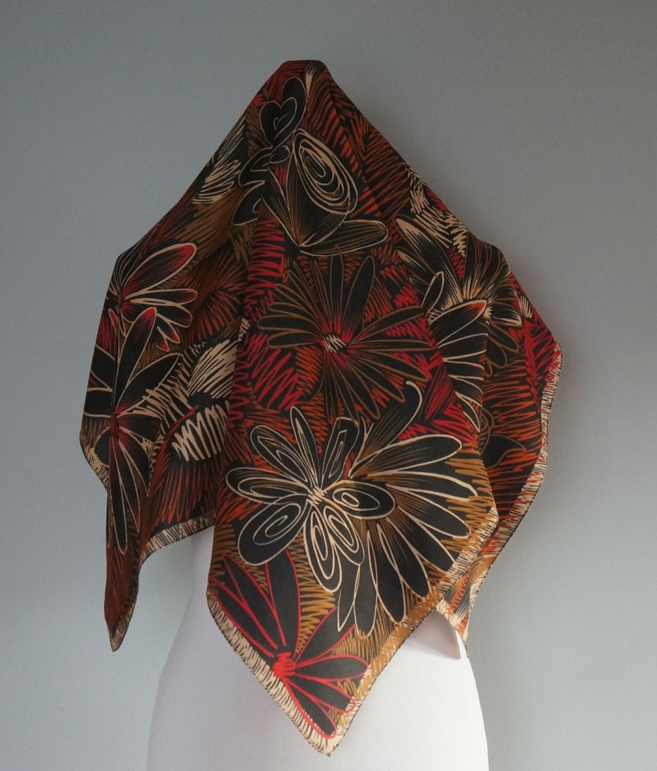 Kwadratowa apaszka. Delikatna tkanina satynowa. Ładna kolorystyka. Stan dobry.
