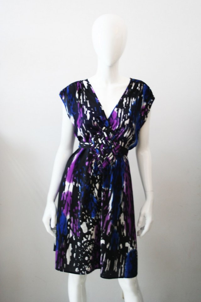 Delikatna tunika, sukienka w kolorowe wzory. Przód zdobiony naszytym materiałem z którego wychodzą paski do wiązania.