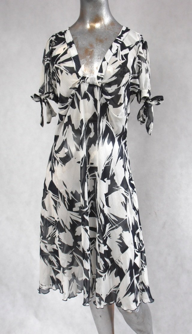 Sukienka przezroczysta,firmy et vous.Rozmiar 14,nasz 40/42.Materiał polyester.Tył odcięty w pasie.Przód odcięty pod biustem,zebrany na środku przy dekolcie.Rękaw krótki,rozcięty na środku z mankietem wiązanym.Całość cięta z ukosa.Stan bardzo dobry-.Długość 106 cm.pod pachami 114 cm.