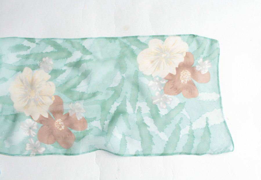 Zwiewny, romantyczny szal we wzory na miętowym tle.