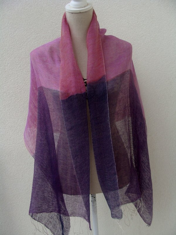 Eteryczny szal z podwójnej tkaniny o bardzo luźnym , delikatnym splocie w kolorystyce granatu, pomarańczu i dwóch odcieni fioletu , które po połączeniu tworzą mieniący się barwami fioletu zwiewny szal. Wykończony frędzelkami.