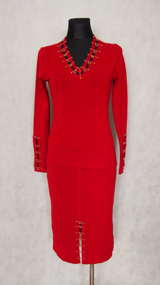 Zestaw idealny dla kobiety sukcesu. Do biura, na firmowe spotkanie. Marki Etincelle Couture. Skład: 80% wiskoza, 18% nylon, 2% spandex. W skład zestawu wchodzą wykonane z niezwykłą starannością o szczegóły: ołówkowa spódnica i kobiecy sweterek.
